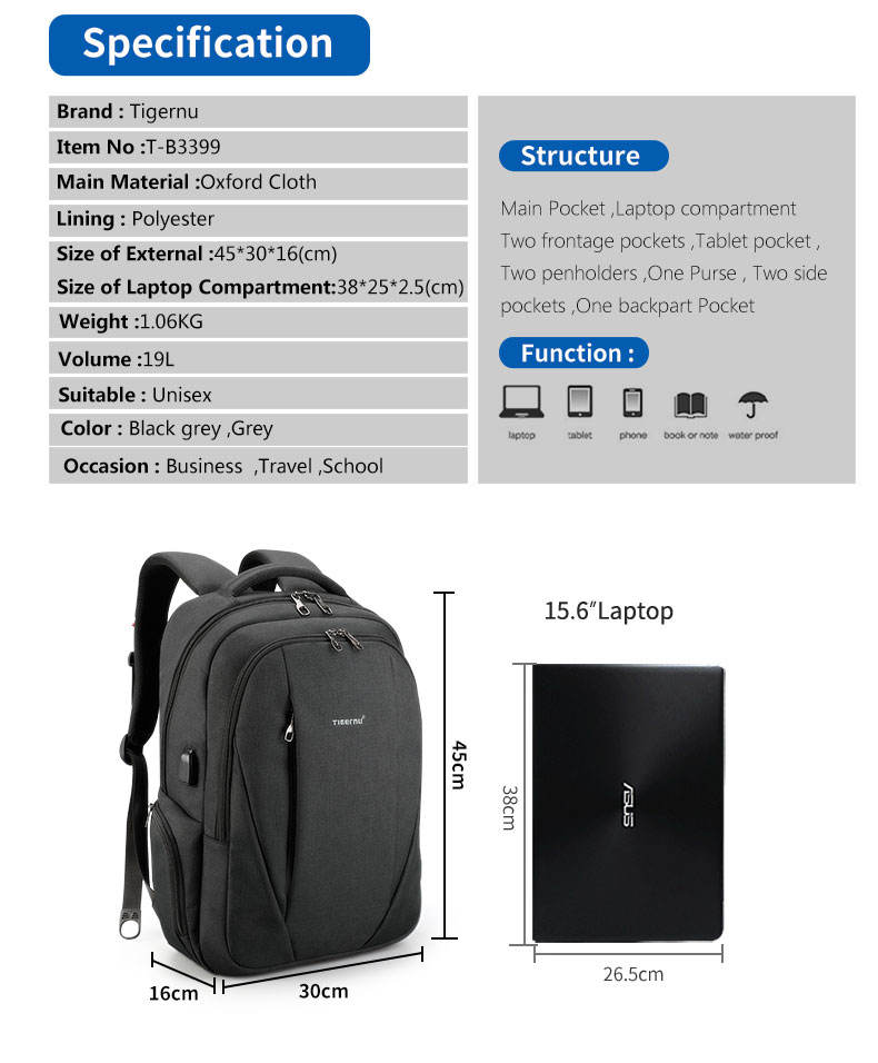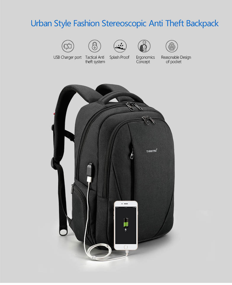 กระเป๋าเป้กันน้ำ Tigernu T-B3399 ป้องกันการโจรกรรม ดีไซน์เรียบง่าย สำหรับผู้ชาย ใส่แล็ปท็อปได้ พร้อมพอร์ตชาร์จ USB