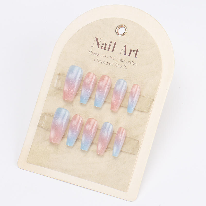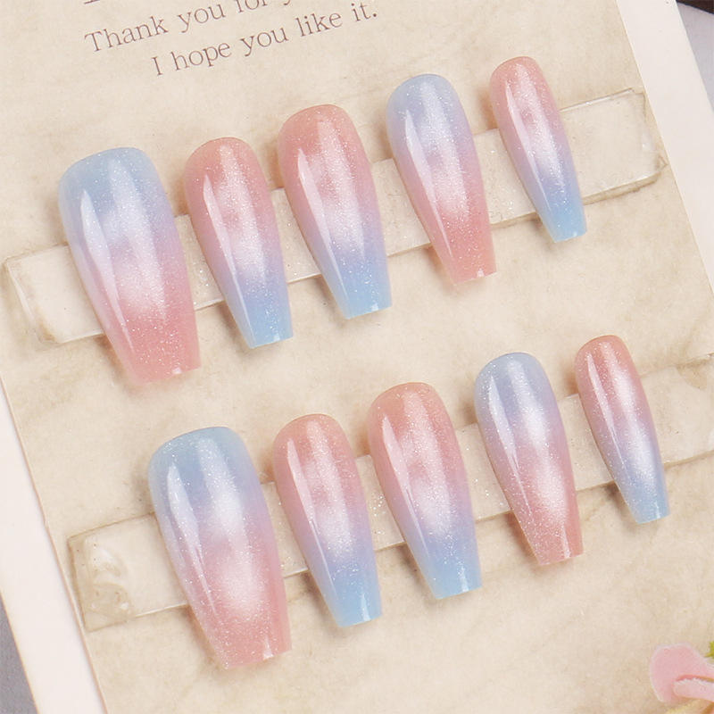 เล็บปลอมติดสำเร็จรูปขนาดกลาง รุ่นขายดีใน TikTok ของฉัน 7 วัน ลายไล่สีชมพูฟ้าแบบตาแมว ปลายเล็บแบบฝรั่งเศส คุณภาพสูง
