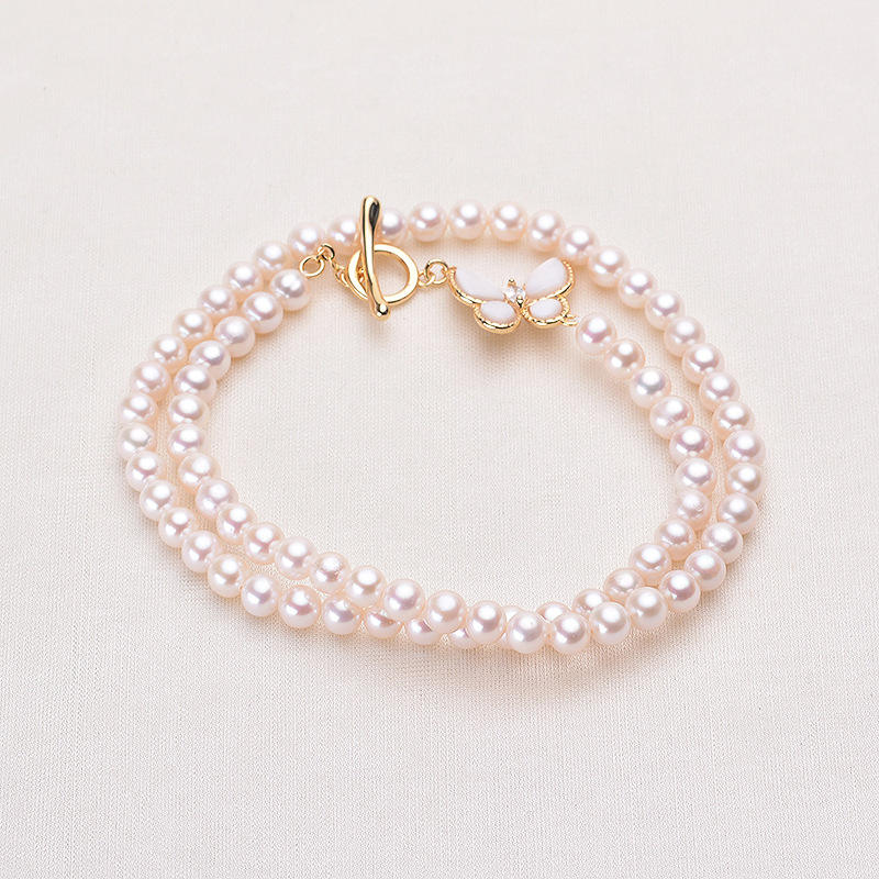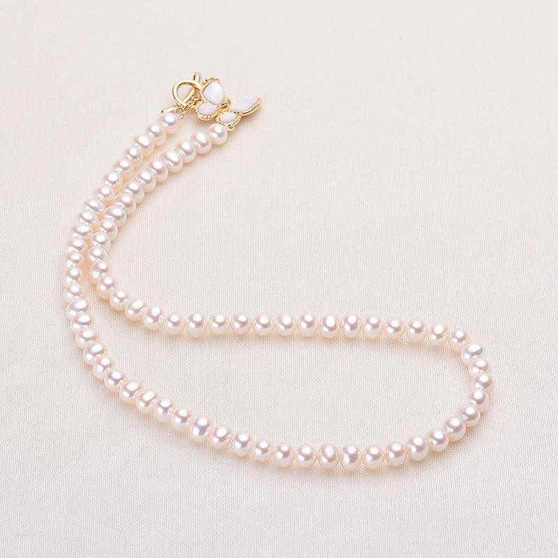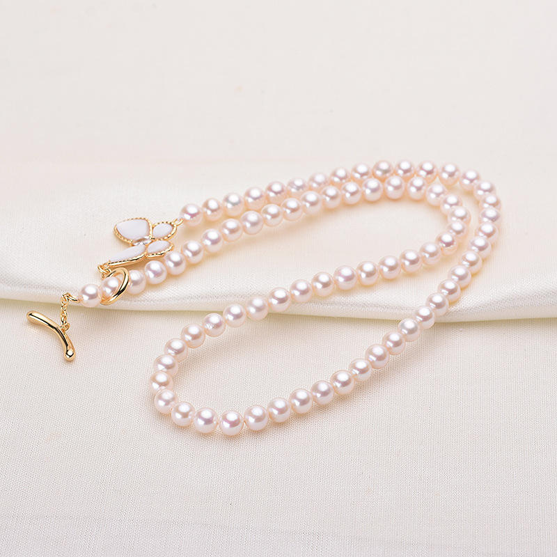 สร้อยคอไข่มุกน้ำจืดสีชมพู 5-6 มม. ของ Tilian Pearl แบบเกือบไร้ตำหนิ ดีไซน์ผีเสื้อโปร่งใส พร้อมไข่มุก 5-6 มม.