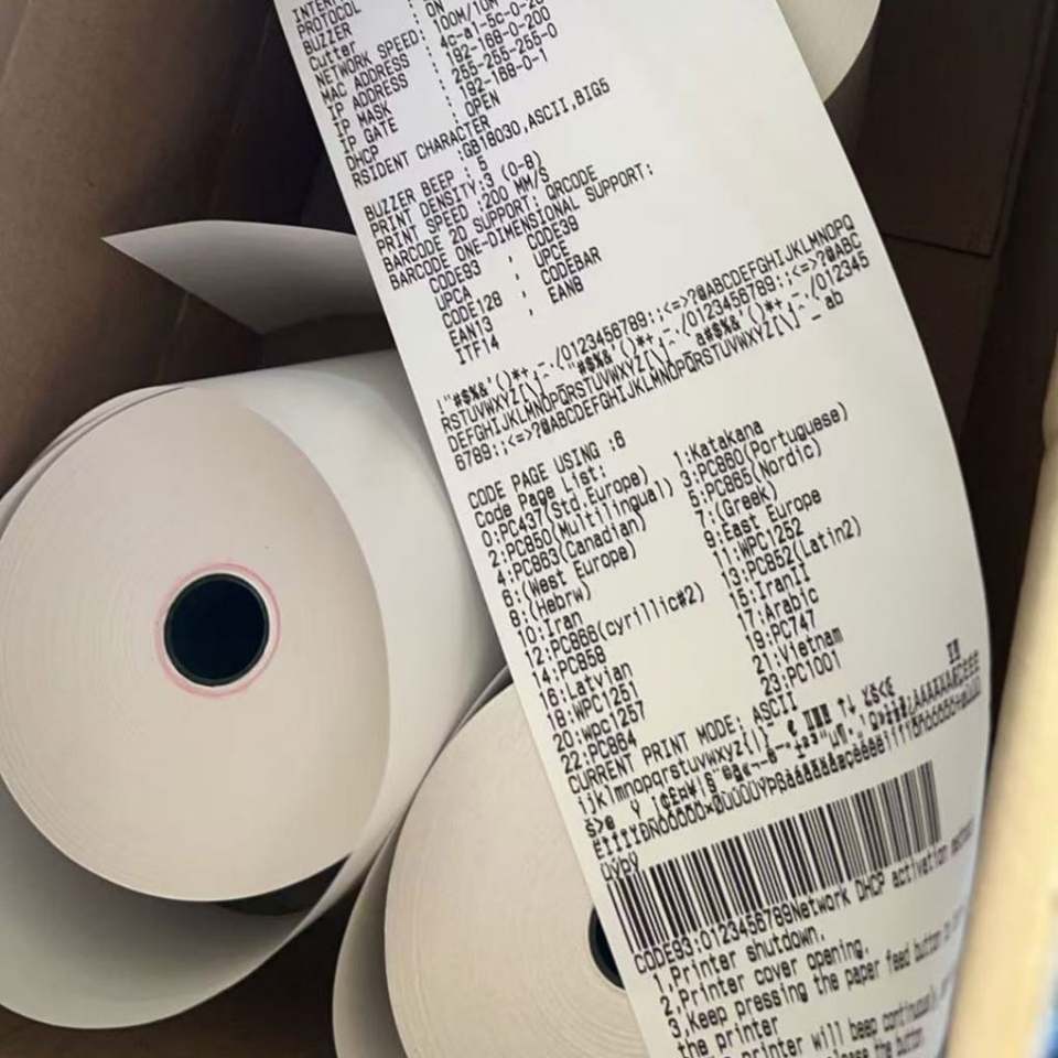 กระดาษม้วนสำหรับเครื่องบันทึกเงินสด ผลิตจากเยื่อไม้ 100% ได้รับการรับรองมาตรฐาน ISO9001 ขนาด 80*80 มม. 57x40 มม. 48-80 แกรม พิมพ์โลโก้ตามสั่งได้