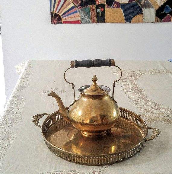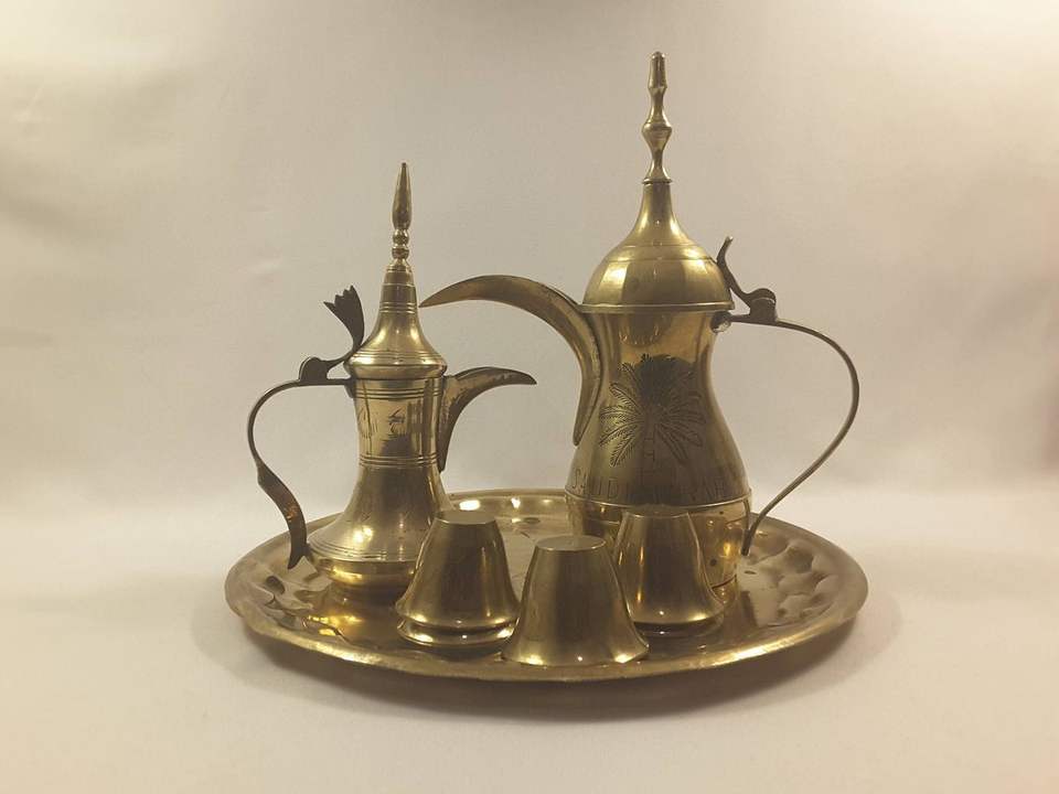 หม้อกาแฟทองเหลืองเหนือกาลเวลาตกแต่งด้วยทองคำรูปทรงแบบดั้งเดิมสำหรับโต๊ะอาหารวัฒนธรรมและของตกแต่งช่างฝีมือทำมือ
