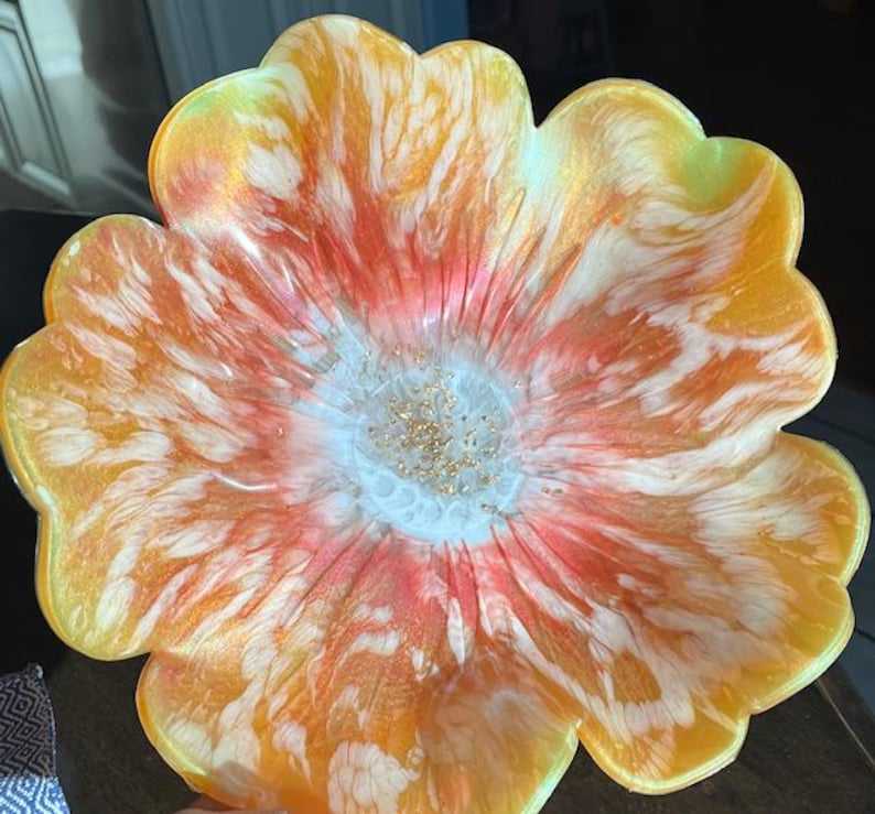 ชามเรซิ่นทำมือลายดอกไม้สีส้มคอรัลทอง งานฝีมือเหนือกาลเวลา สามารถปรับแต่งสีและลวดลายได้ จานตกแต่งกลางโต๊ะ