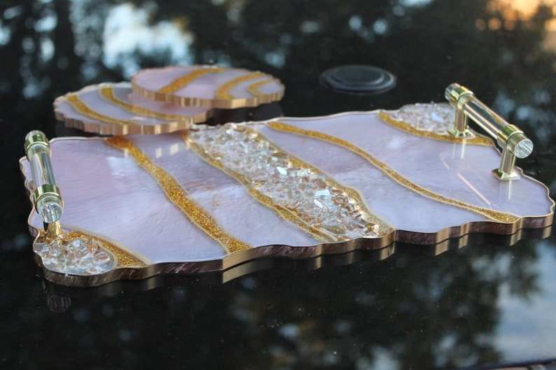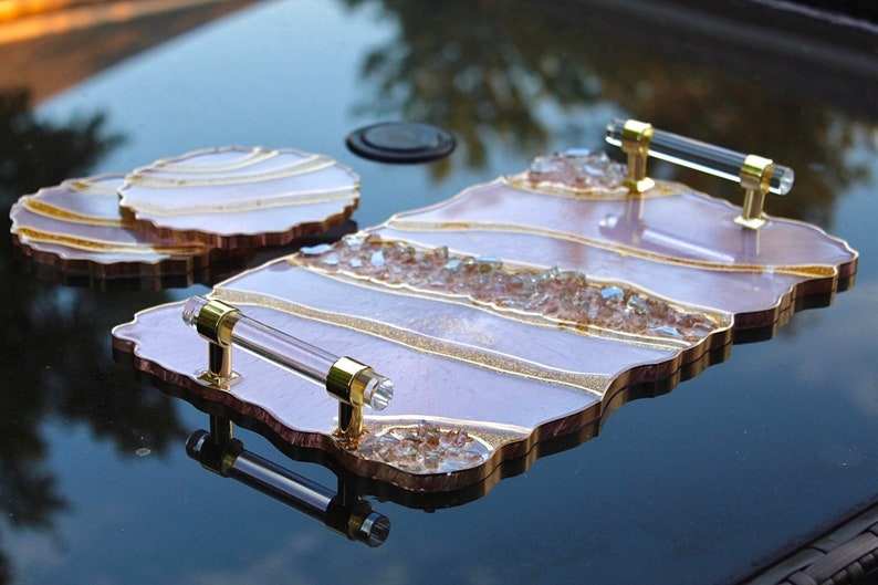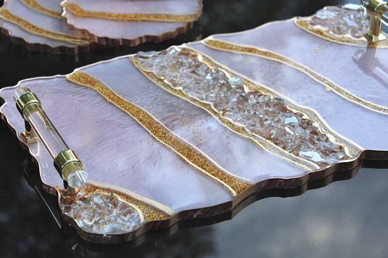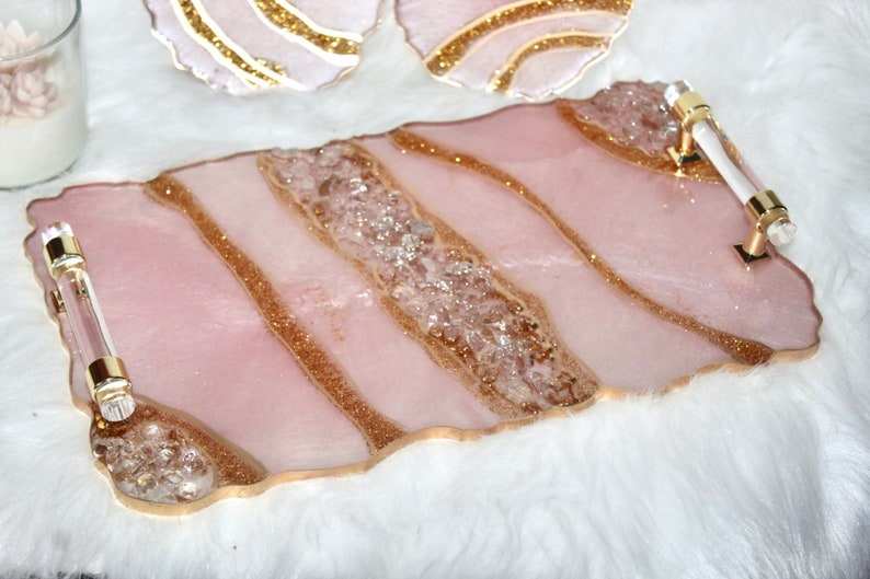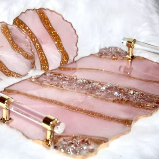 ถาดเรซิ่นกลิตเตอร์สีโรสโกลด์ทำมือทรงคลาสสิก พร้อมหูจับคริสตัลสีทอง ปรับแต่งได้ ถาดอเนกประสงค์และจานรองแก้วสุดหรู