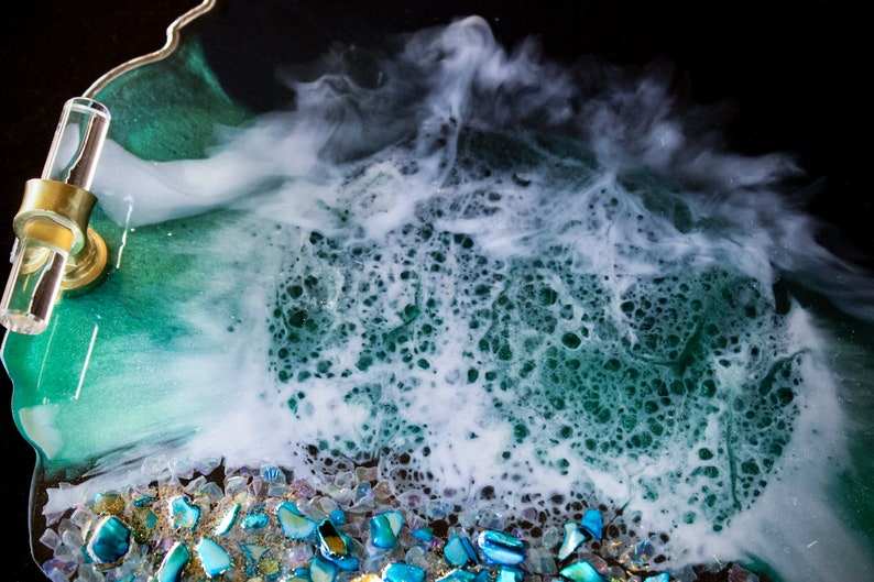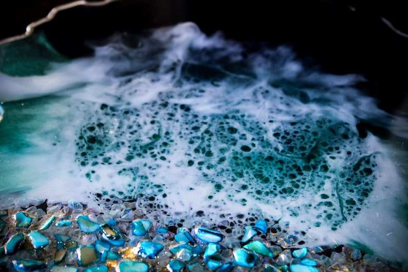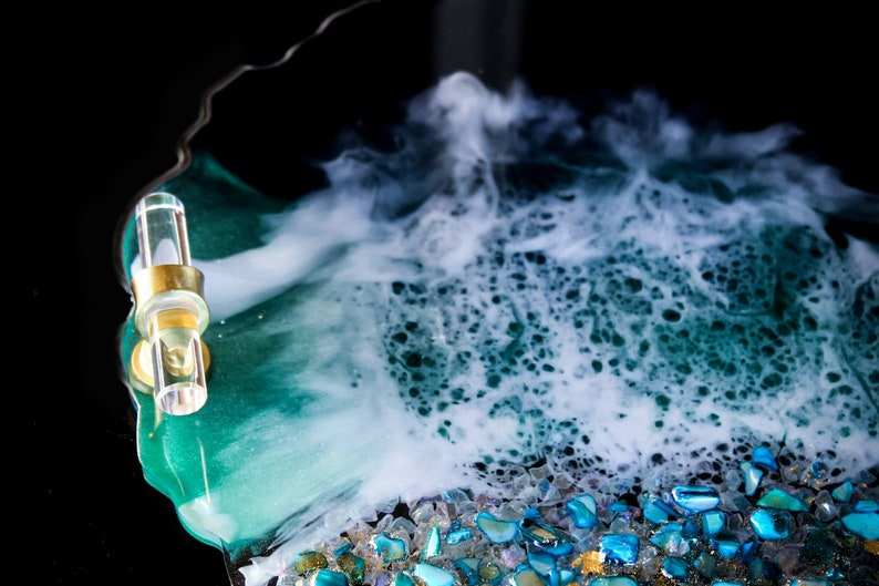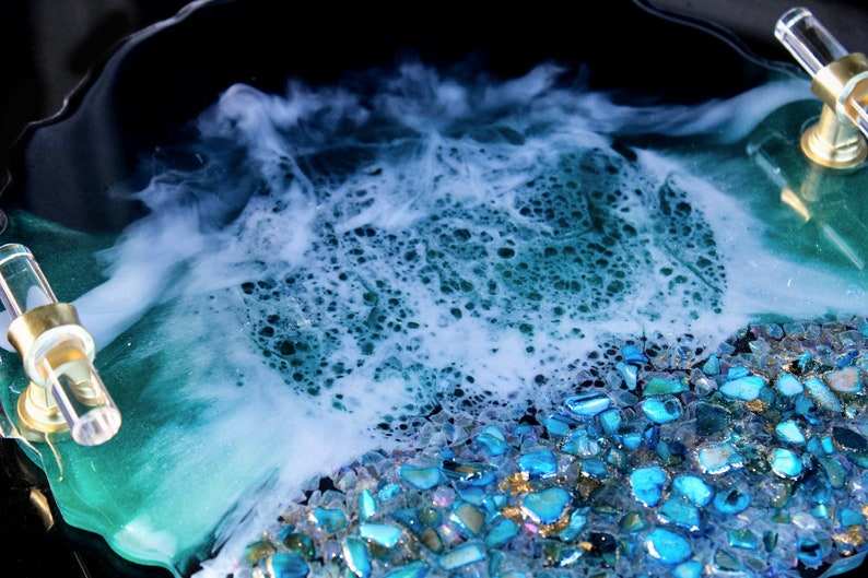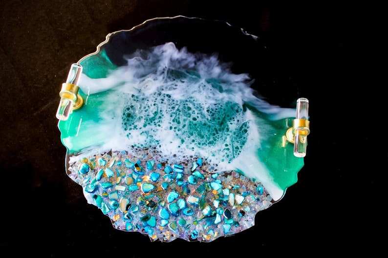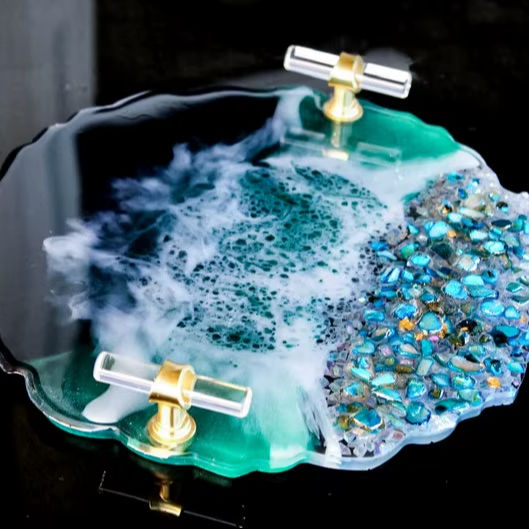 ถาดเสิร์ฟเรซิ่นรูปทรงโอเชียนจีโอด งานฝีมือเหนือกาลเวลา ประดับด้วยคริสตัล ดีไซน์ศิลปะชายหาดแบบอีพ็อกซี่ ทำด้วยมือ ขนาดสั่งทำได้ พร้อมหูจับสีทอง
