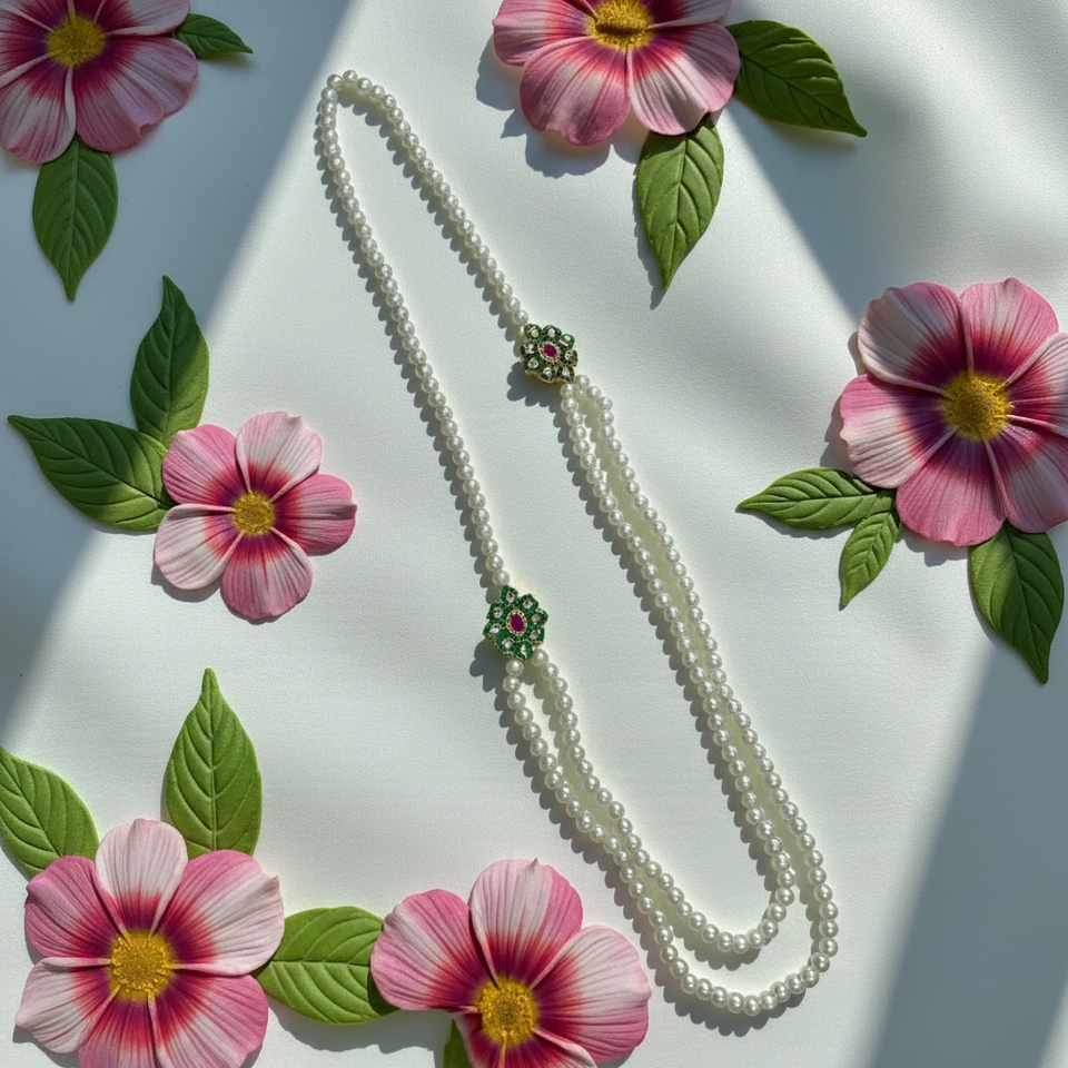 สร้อยคอมุกสองชั้นหรูหราเหนือกาลเวลาพร้อมดอกไม้สไตล์ทางศาสนาที่สง่างาม