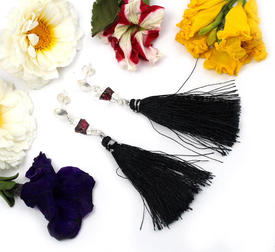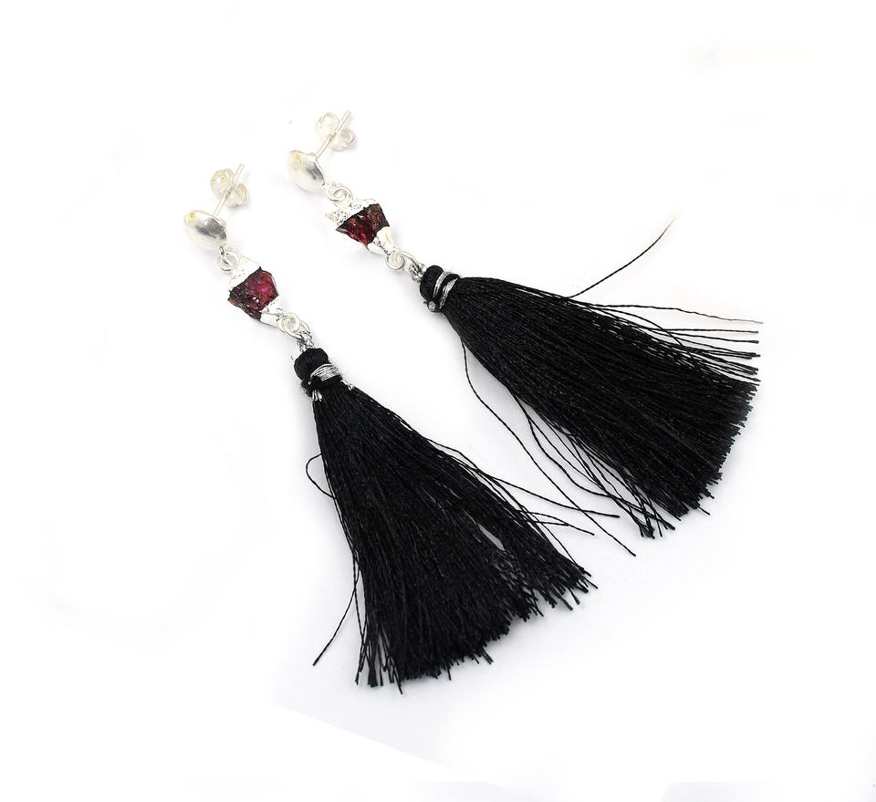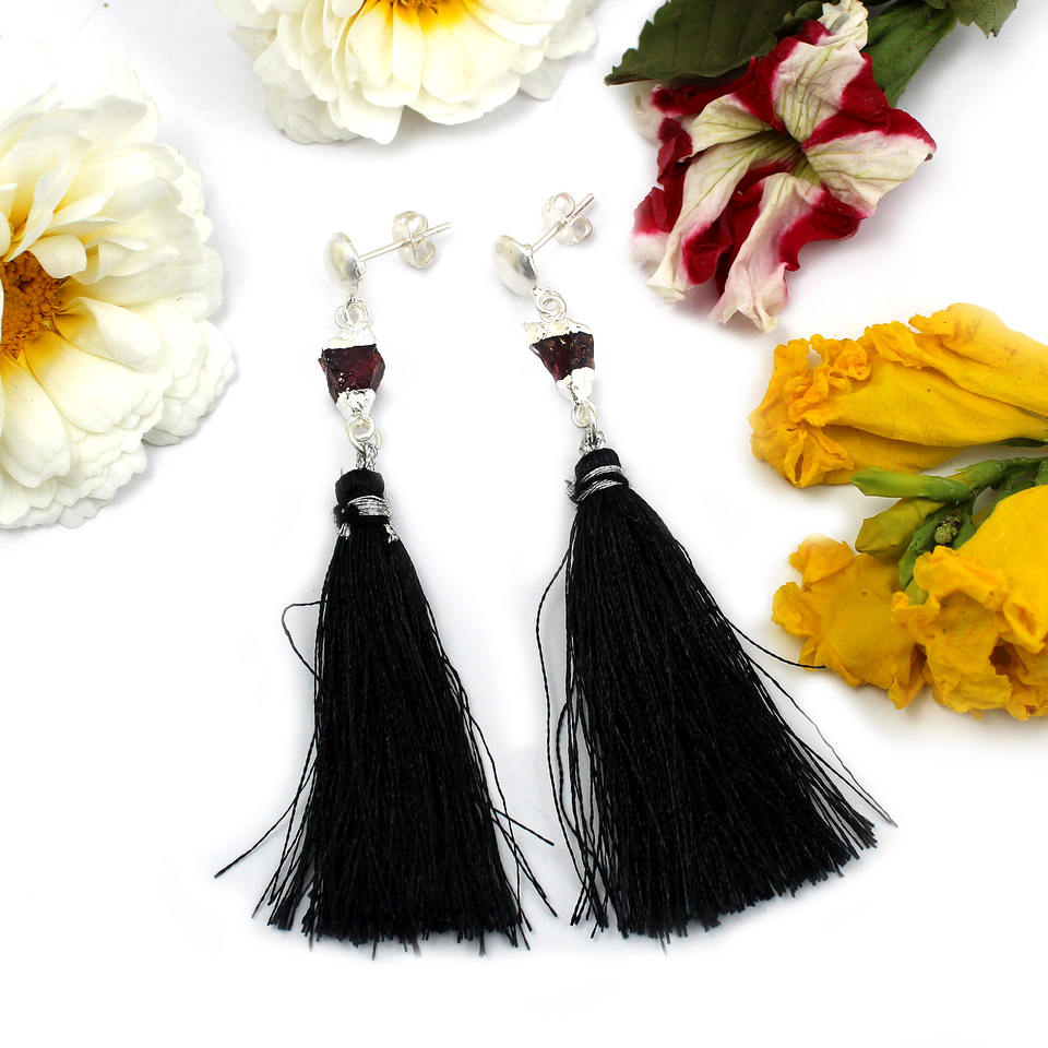 แฟชั่นอมตะหินโกเมนสีแดงหยาบธรรมชาติทรงแฟนซีต่างหูห้อยชุบเงินเครื่องประดับทองเหลืองสำหรับผู้หญิงขายส่ง