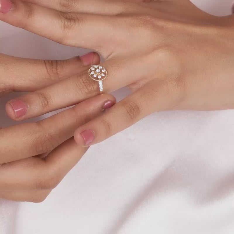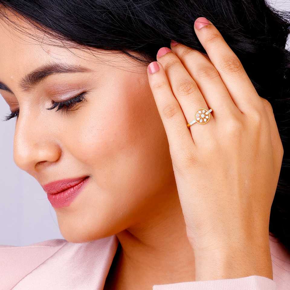 แหวนเพชรรูปดอกไม้บานสีทองเหนือกาลเวลาที่สร้างขึ้นสำหรับข้อความแฟชั่นที่สง่างาม