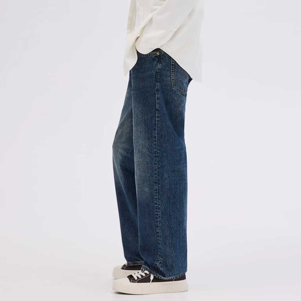 กางเกงยีนส์ทรงตรงเอวสูงทรงคลาสสิก ผ้าฝ้ายทนทาน สไตล์วินเทจเบาๆ ใส่ได้ทุกวัน ใส่ได้ทั้งชายและหญิง สบายๆ ใช้งานได้หลากหลาย