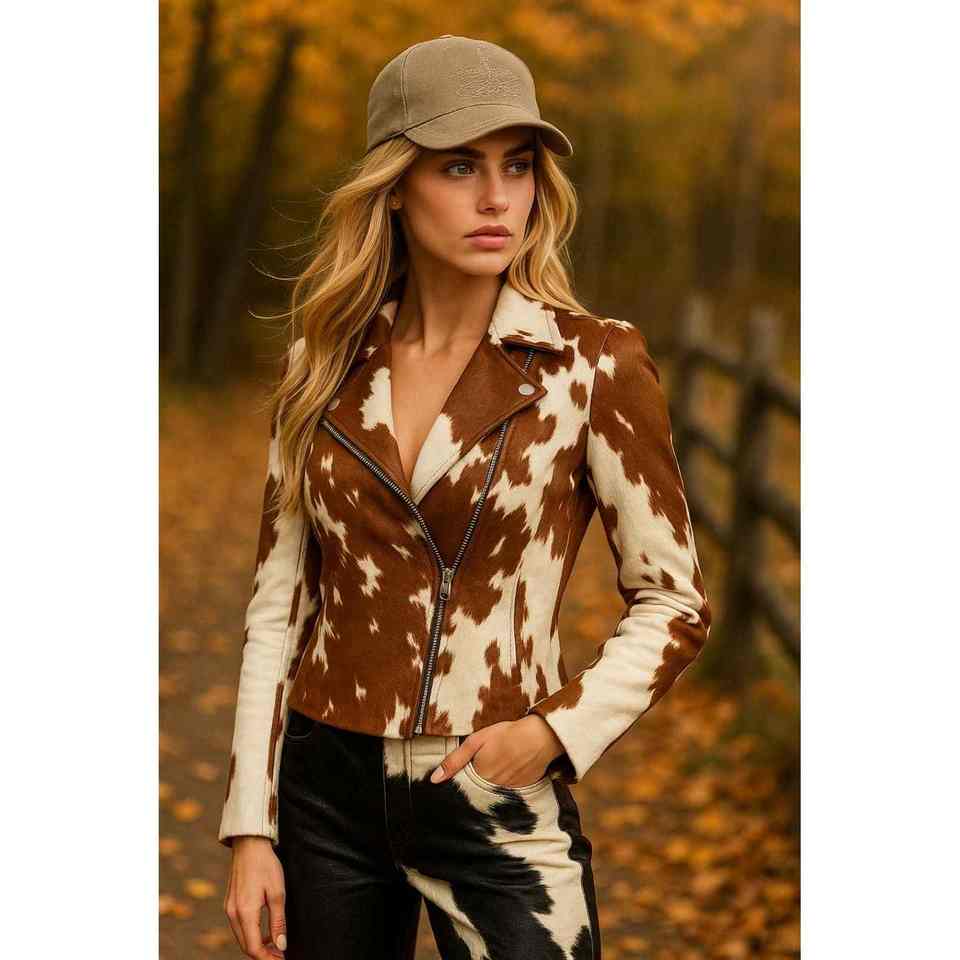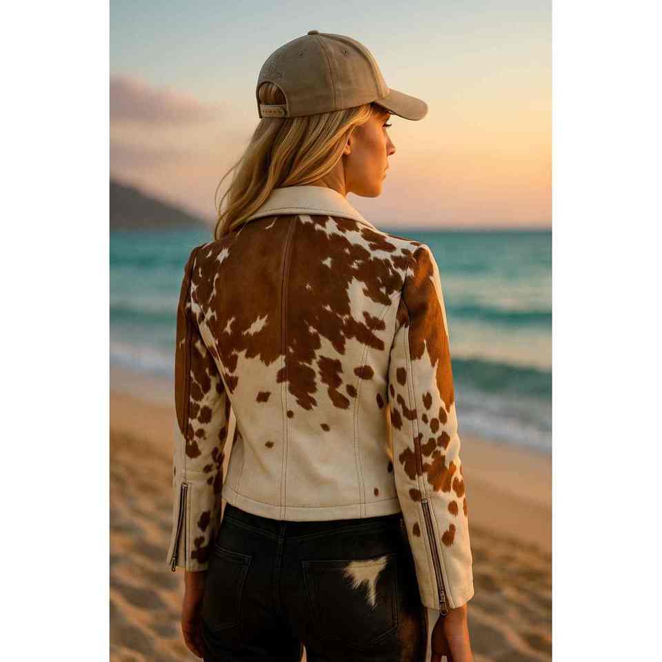 เสื้อแจ็คเก็ตหนังวัวแท้สำหรับผู้หญิง ดีไซน์ขนวัวสุดหรู ดูสง่างามเหนือกาลเวลา