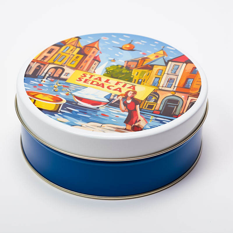 กล่องดีบุกโลหะสำหรับเทศกาลคริสต์มาสทรงกลมพิมพ์โลโก้ตามสั่ง