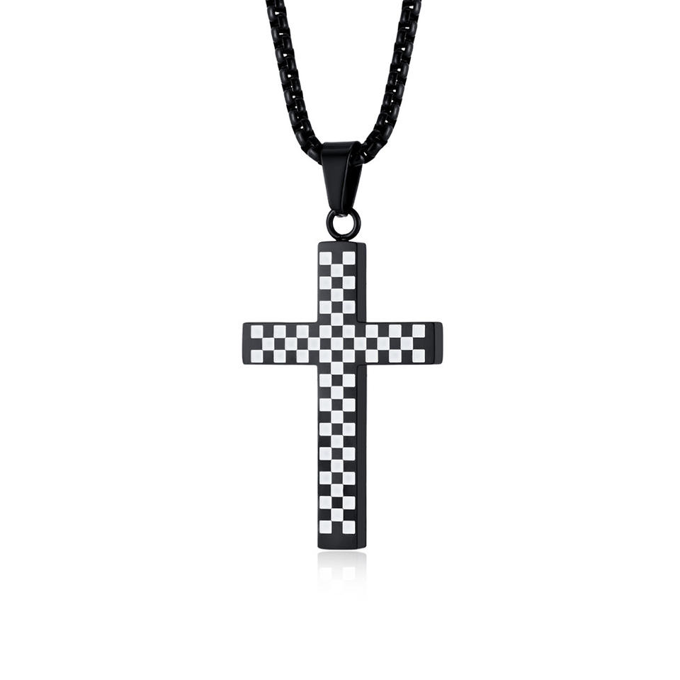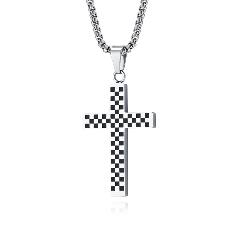 สร้อยคอไทเทเนียมสตีลลายตารางขาวดำ จี้รูปกากบาท ทรงเรขาคณิต ของขวัญเครื่องประดับสำหรับทุกเพศ