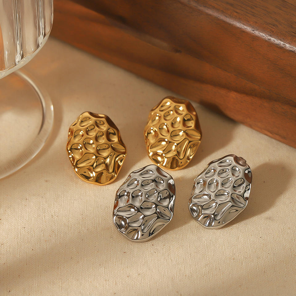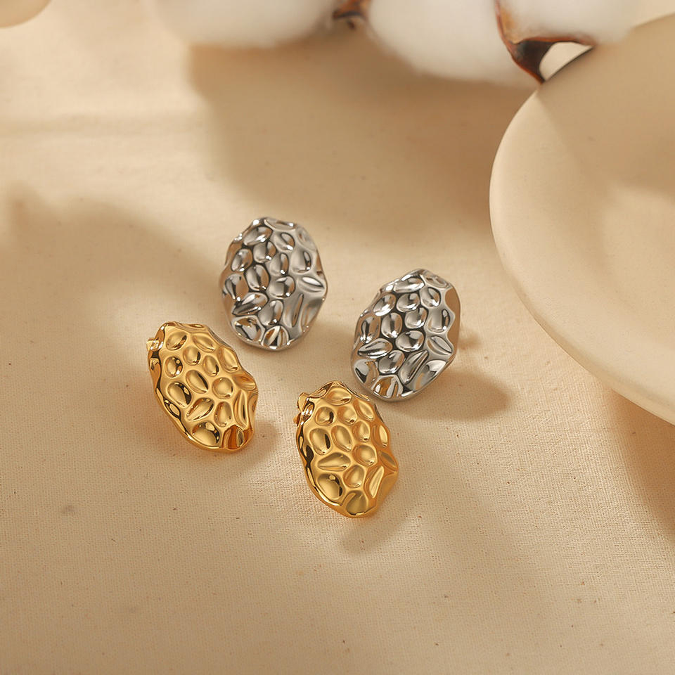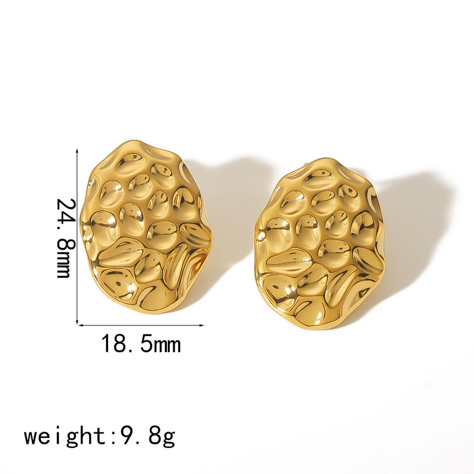 ต่างหูหมุดเหล็กไทเทเนียมทรงรีลายค้อนเครื่องประดับแฟชั่นชุบทอง18K สำหรับ TE6588ผู้หญิง