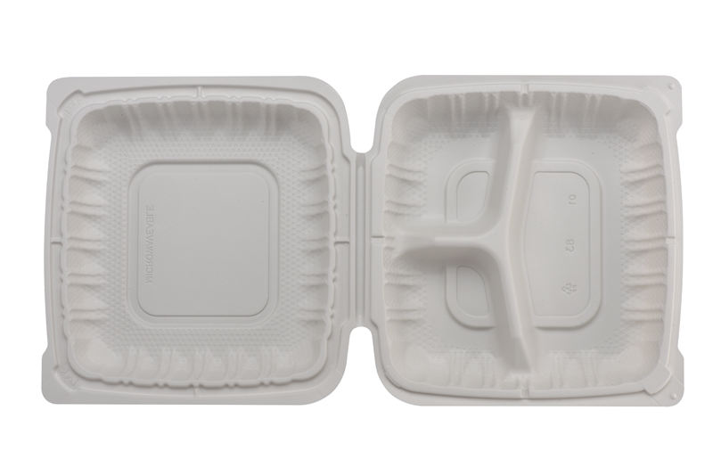 กล่องใส่อาหารแบบใช้แล้วทิ้ง 3 ช่อง สีขาว ฝาพับ ผลิตจากพลาสติก PP เกรดสำหรับอาหาร ปลอดสาร BPA สามารถวางซ้อนกันได้ ใช้กับไมโครเวฟได้