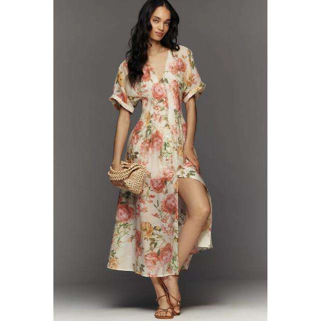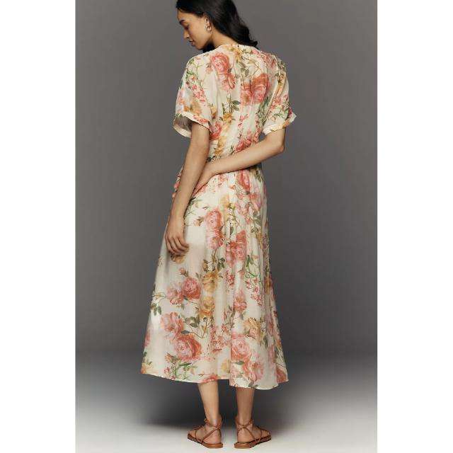 เดรสลำลองผ้าฝ้ายทรงเอไลน์ แขนสั้น คอวี แขนพอง ลายดอกไม้ สำหรับผู้หญิง ยี่ห้อ Tobie