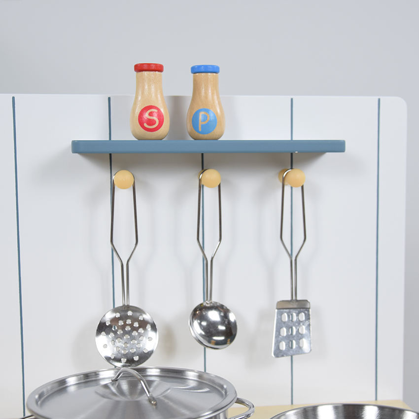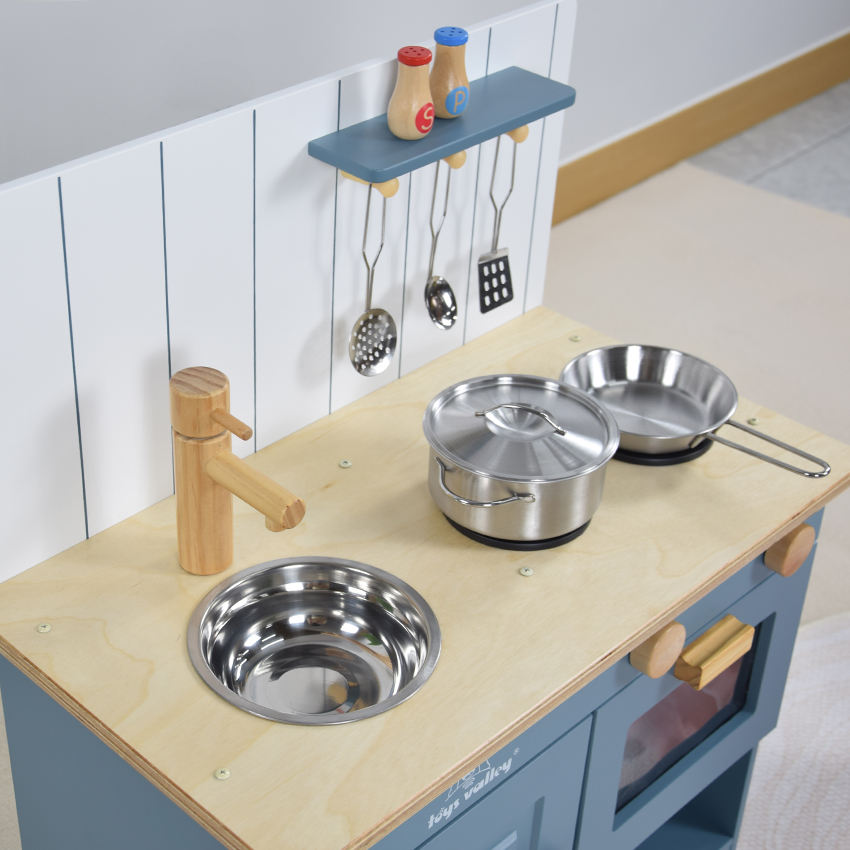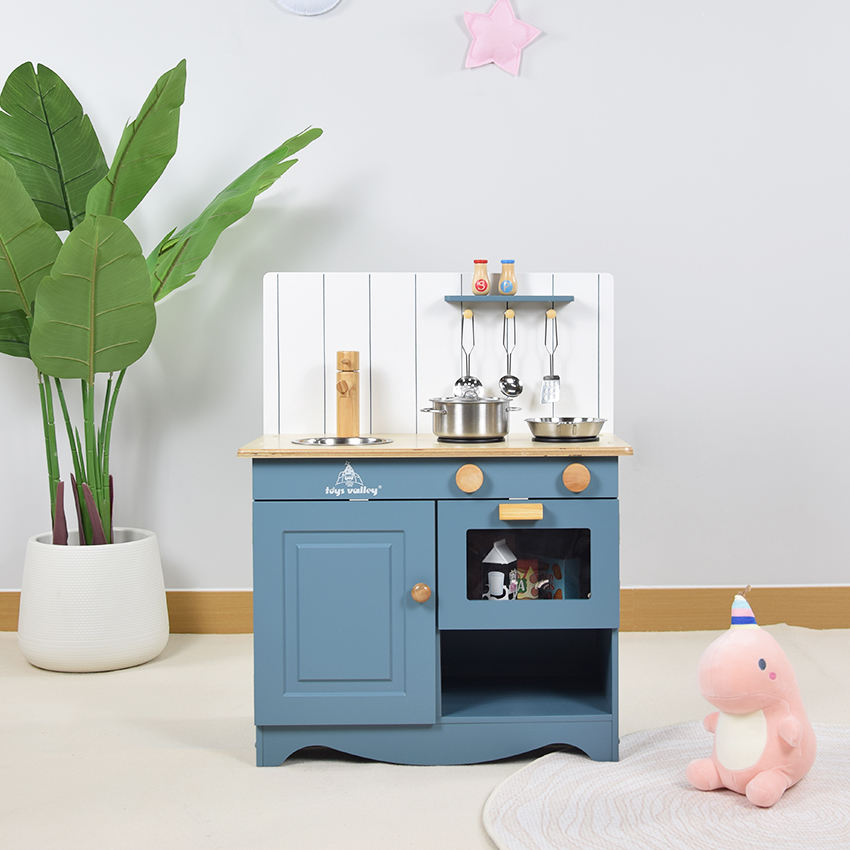 ชุดครัวไม้สีฟ้าสำหรับเด็กวัยเตาะแตะ พร้อมอุปกรณ์ทำอาหาร เตาอบ ไมโครเวฟ อ่างล้างจานและก๊อกน้ำ ของเล่นเสริมสร้างจินตนาการ