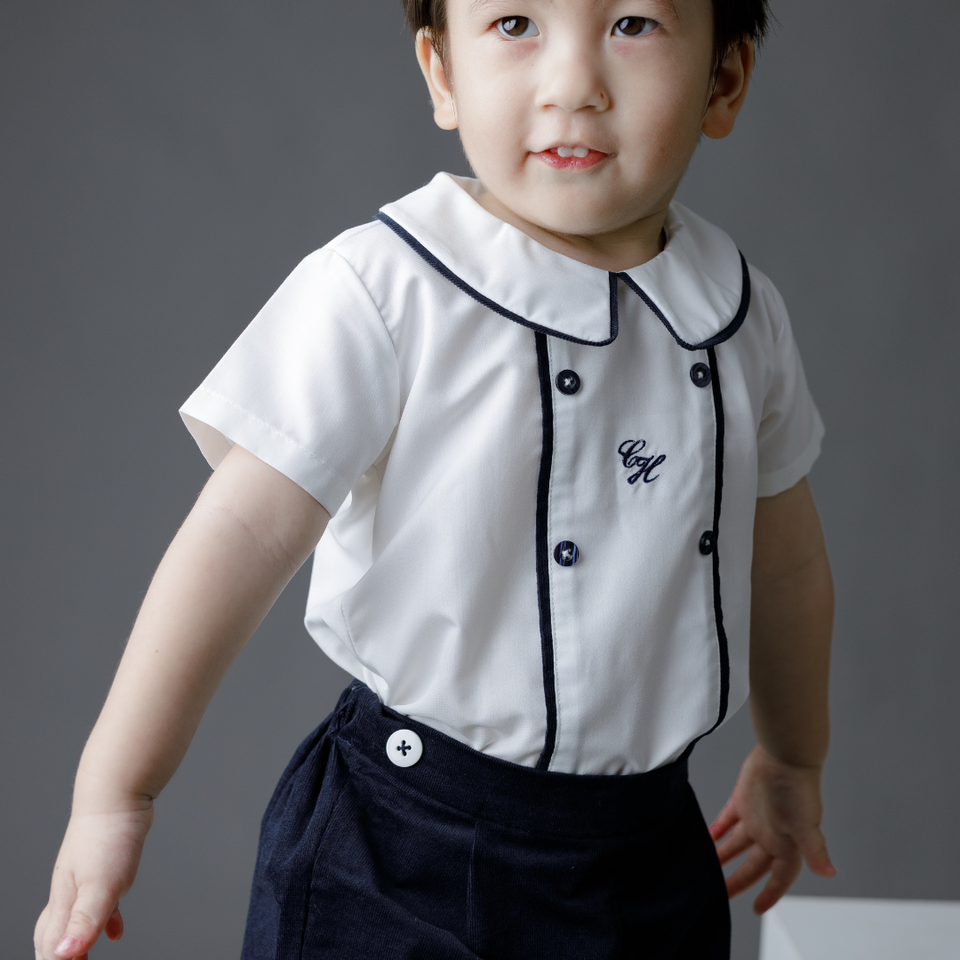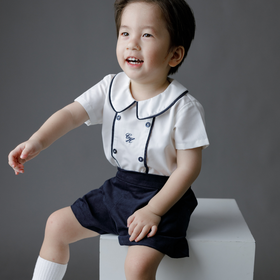 ชุดเสื้อผ้าเด็กผู้ชายวัยหัดเดิน2ชิ้นเสื้อเชิ้ตแขนสั้นสีน้ำเงินและผ้าฝ้ายสีดำสำหรับโอกาสพิเศษดีไซน์พรีเมียมสำหรับงานวันเกิด