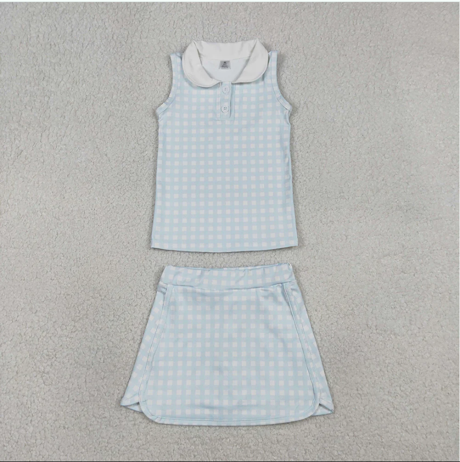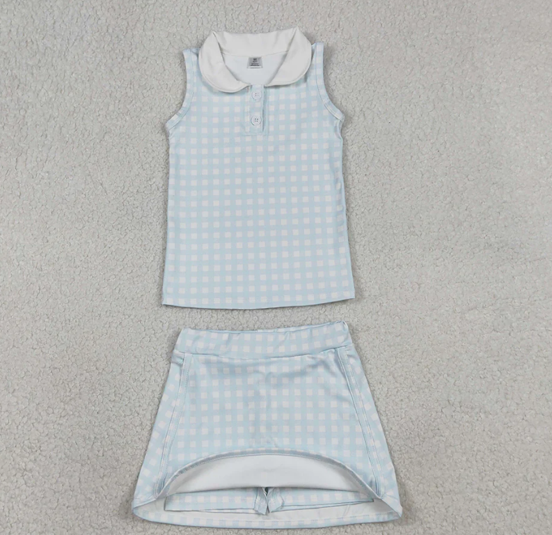 เด็กผู้หญิงวัยเตาะแตะ GSD3375 เสื้อกั๊กลายสก๊อตสีฟ้าอ่อนกระโปรงกางเกงขาสั้นชุดเสื้อผ้าโยคะฤดูร้อนสำหรับเด็กผู้หญิง