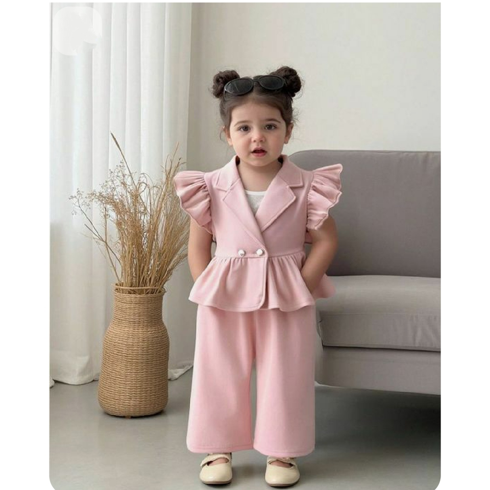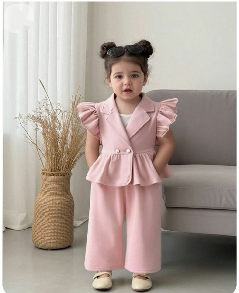 ชุดเสื้อเบลเซอร์แขนระบายทรงเปปลัมและกางเกงขายาวสำหรับเด็กผู้หญิงวัยเตาะแตะ ชุดสูท 2 ชิ้นสีพาสเทลสำหรับสาวน้อยสุดเท่