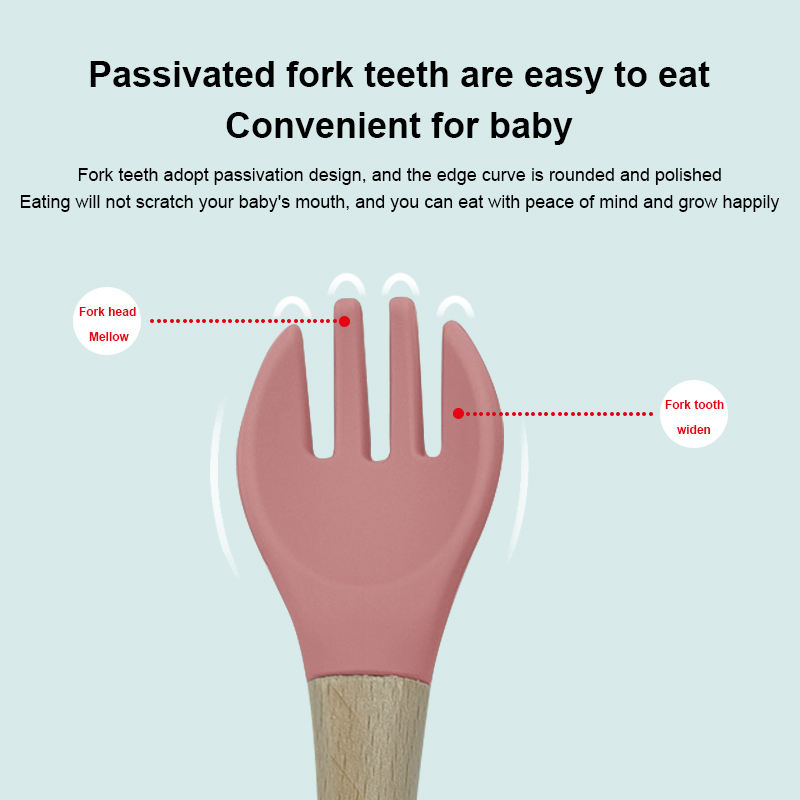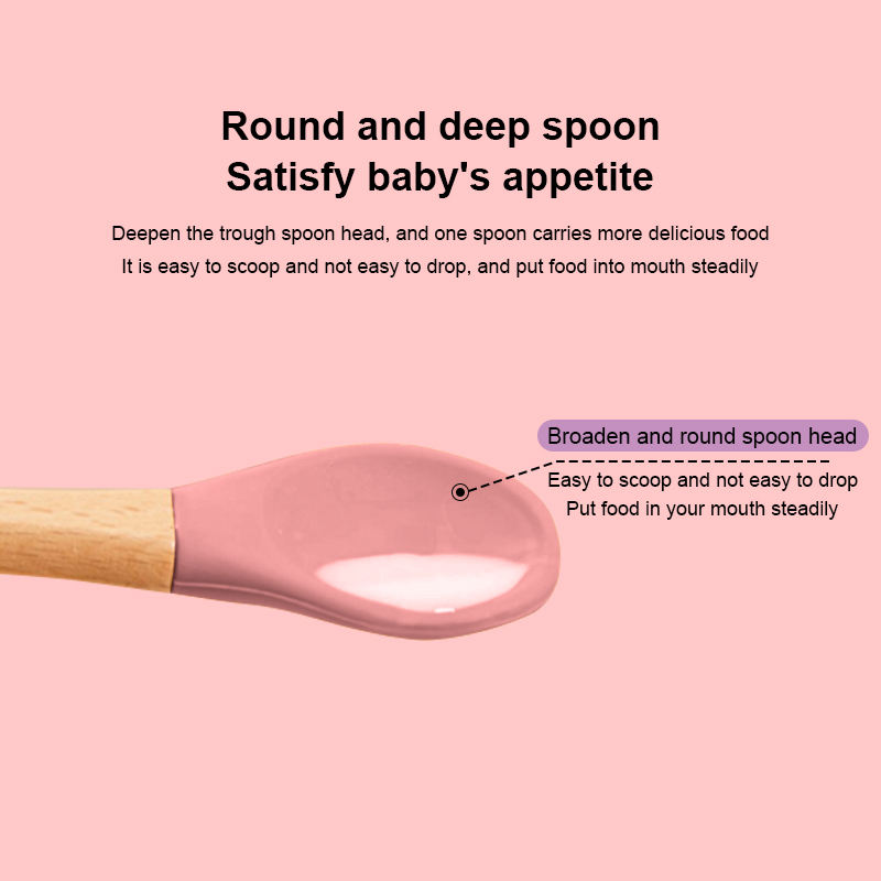 ชุดช้อนไม้ซิลิโคนออร์แกนิกสำหรับเด็กเด็กหัดเดินพร้อมสายรัดป้องกันการตกชุดป้อนอาหารเด็กแบบนิ่มพร้อมโลโก้