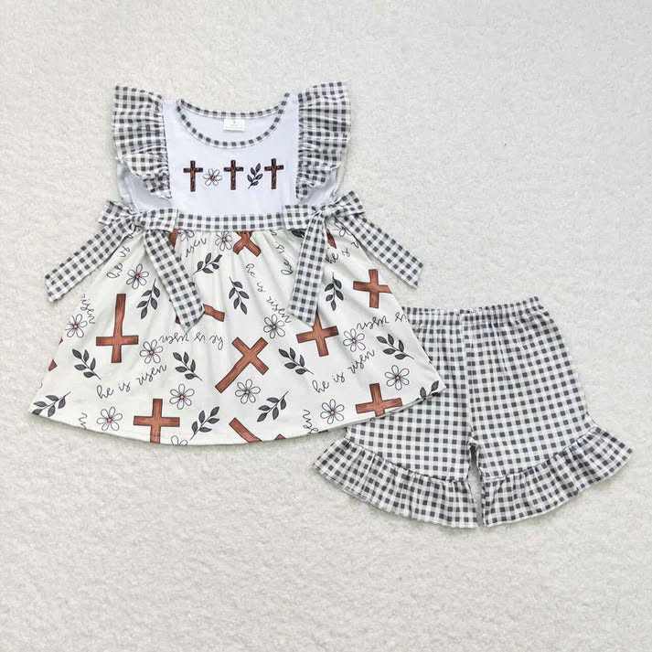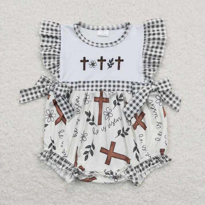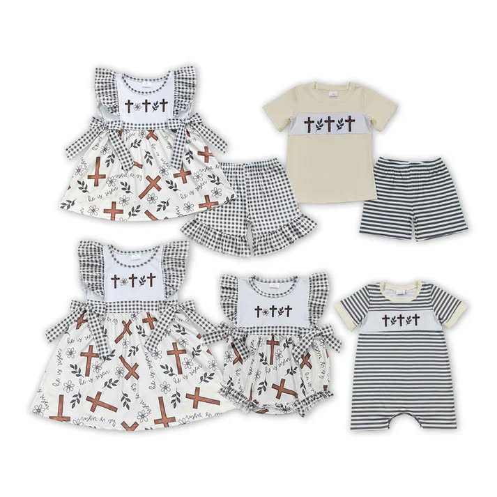 ชุดเสื้อผ้าเด็กสำหรับเทศกาลอีสเตอร์ลายตารางปักลายกากบาทสำหรับเด็กวัยเตาะแตะและพี่น้อง