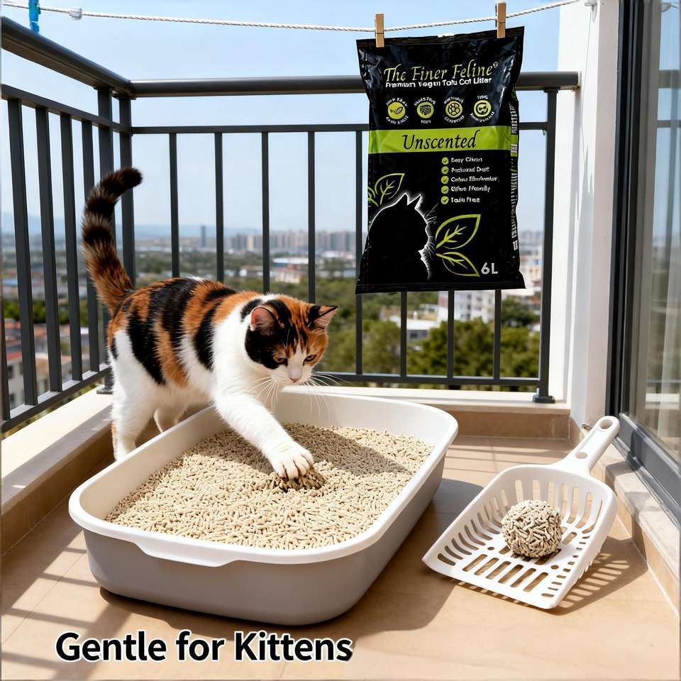 ถาดทรายแมวทำจากเต้าหู้ ย่อยสลายได้ เป็นมิตรกับสิ่งแวดล้อม ทำจากไม้สน คาร์บอนกัมมันต์ แป้งข้าวโพด ใช้กับโถสุขภัณฑ์ได้ ไม่ก่อให้เกิดก้อนอุดตัน
