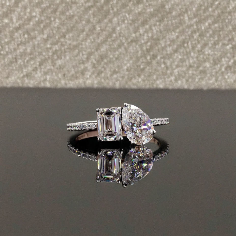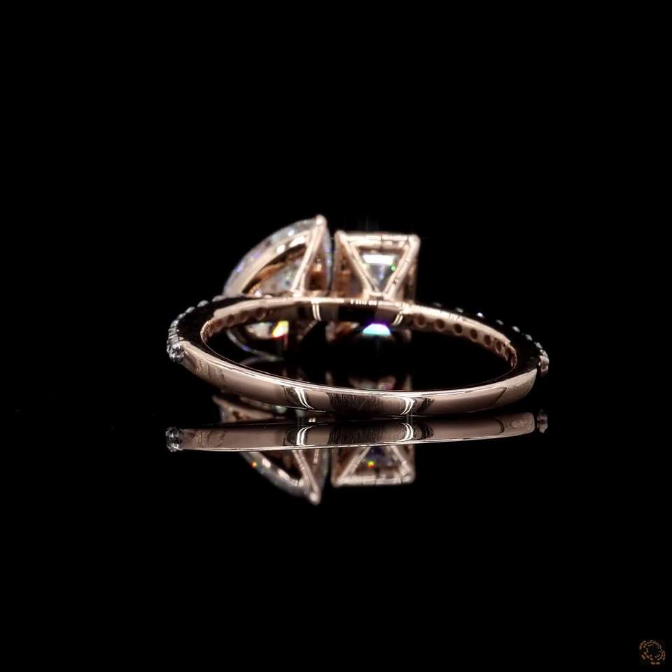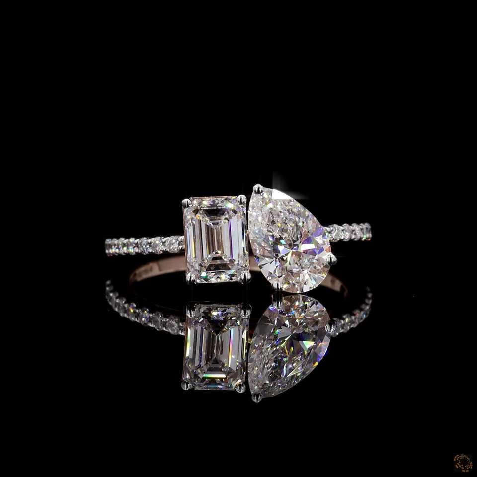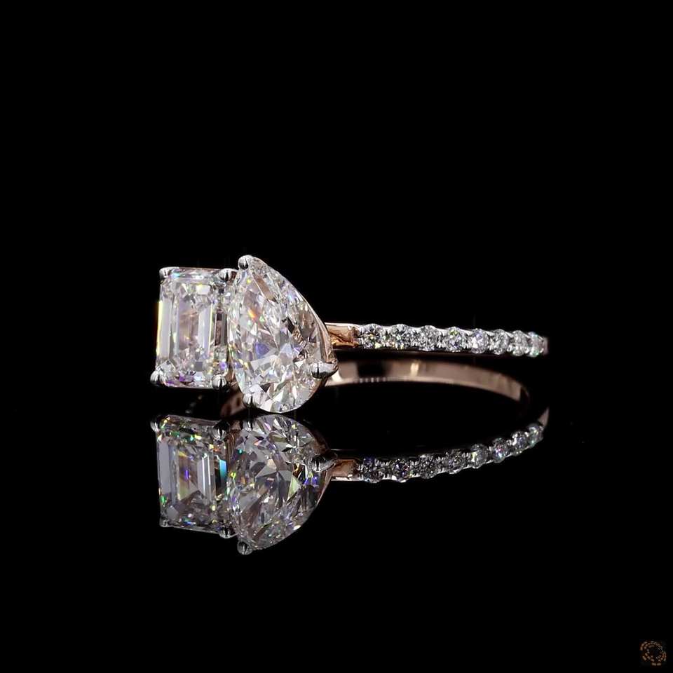 Toi et Moi แหวนเพชรสอง2.30ct 14K ลูกแพร์สีโรสโกลด์แข็งและมรกตตัดแหวนหมั้นสำหรับวันครบรอบ