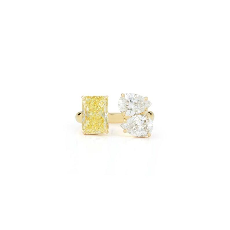 Toi et Moi แหวนเพชรสัญญาประดับเพชรลูกแพร์สีขาวและสีเหลืองมรกตสำหรับปลูกในห้องปฏิบัติการเครื่องประดับทอง14K สำหรับของขวัญหมั้นสำหรับพันธมิตร