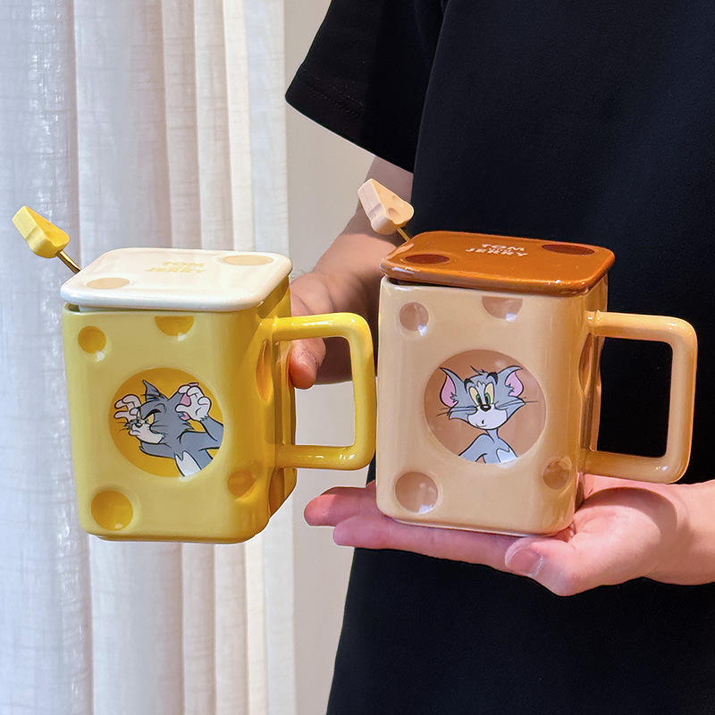 แก้วเซรามิคทอมแอนด์เจอร์รี่พร้อมฝาและช้อน ลายชีส แก้วการ์ตูนน่ารักสำหรับเป็นของขวัญ
