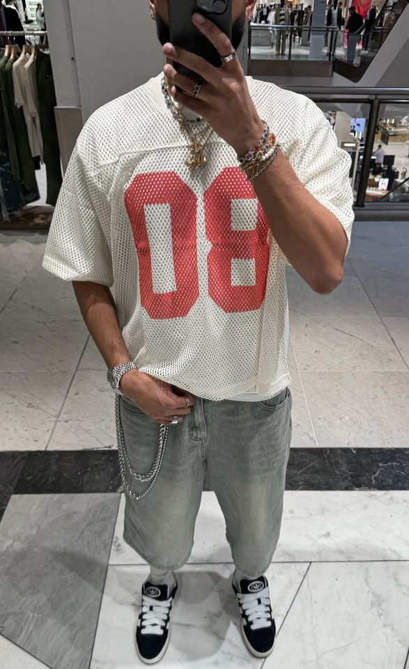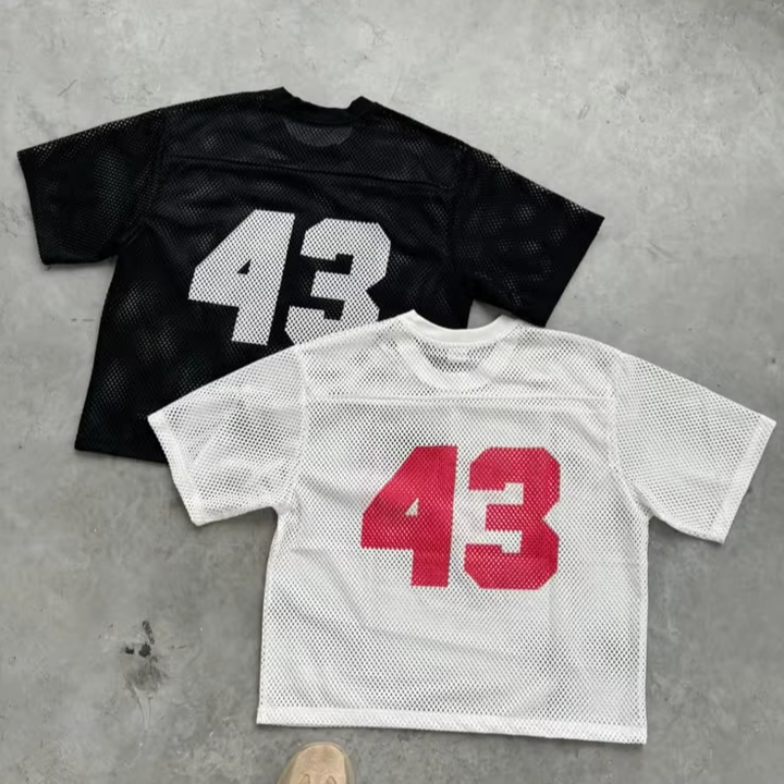 เสื้อเจอร์ซีย์ฟุตบอลทรงโอเวอร์ไซส์สำหรับผู้ชาย แบรนด์ Tontons ผ้าตาข่ายระบายอากาศได้ดี ไซส์พลัส ทรงครอป คอวี พิมพ์ลายกราฟิกด้วยเทคนิค Heat-Transfer