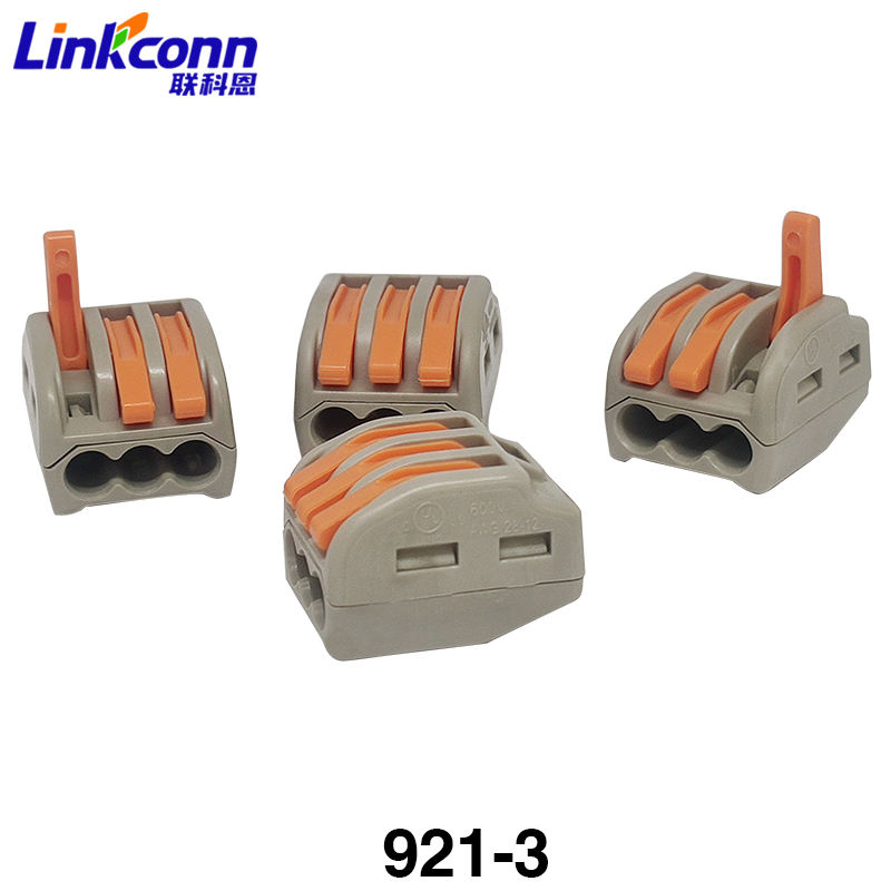 การเชื่อมต่อโดยไม่ต้องใช้เครื่องมือสายไฟ3ขาขั้วต่อสายไฟแบบเร็วอุปกรณ์เสริมประเภทคันโยกง่าย921-3 P cUL จดทะเบียน