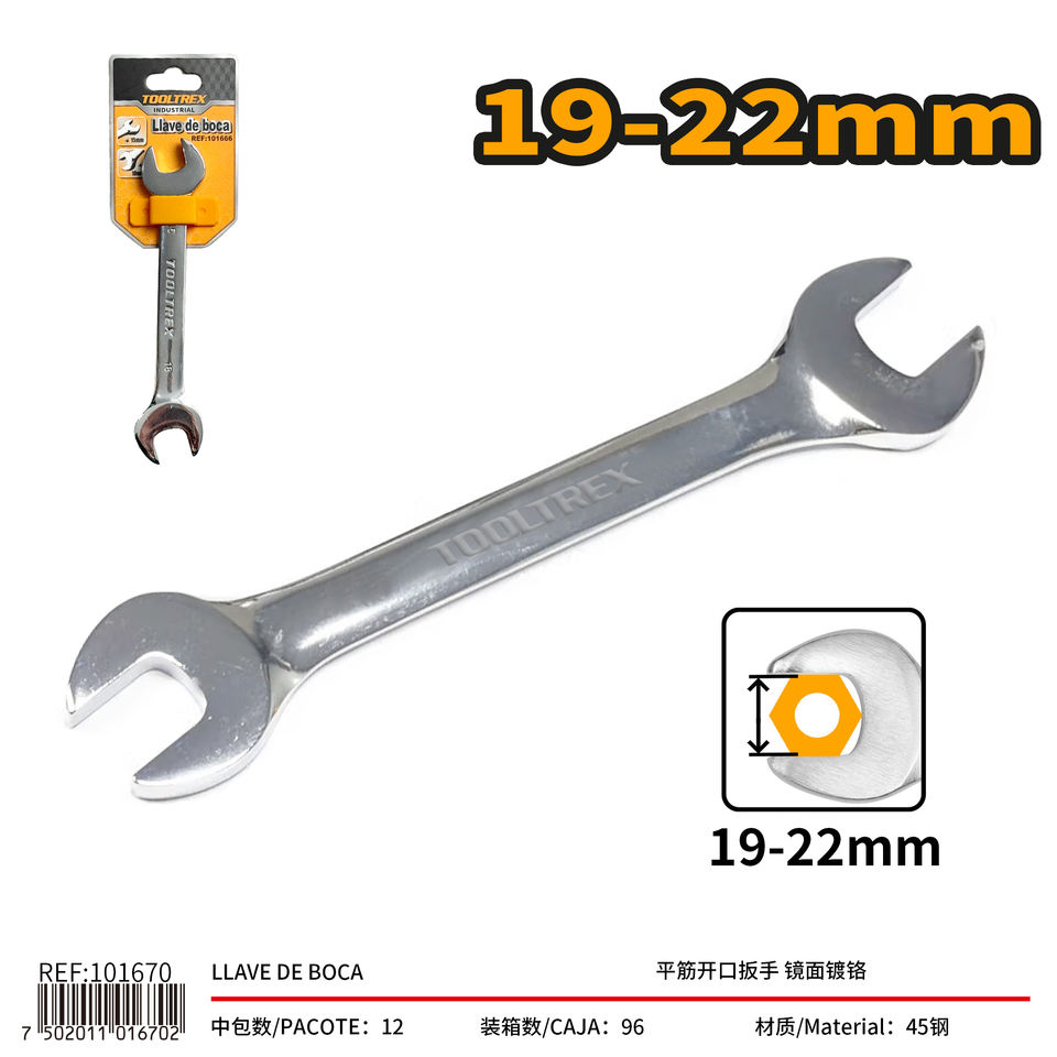 ประแจปากตายแบบเปิด ทูลเทร็กซ์ ขนาด 19-22 มม. ชุบโครเมียมแบบกระจก เครื่องมือซ่อมยาง