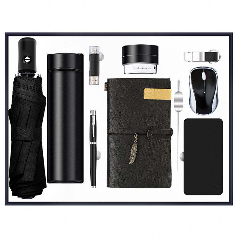 ชุดของขวัญ 10-in-1 ประกอบด้วย สมุดโน้ต ร่ม ลำโพงบลูทูธ แก้วเก็บความร้อน ปากกา แฟลชไดรฟ์ USB พาวเวอร์แบงค์ พวงกุญแจ เมาส์ และที่คั่นหนังสือ