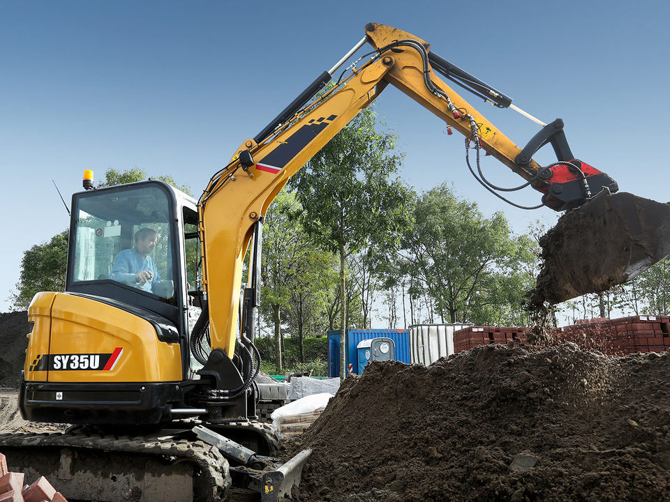 รถขุดขนาดเล็กยอดนิยม ยี่ห้อดัง รุ่น SY35U น้ำหนัก 3.5 ตัน ได้มาตรฐาน EPA พร้อมถังขุดขนาด 0.12 ลูกบาศก์เมตร