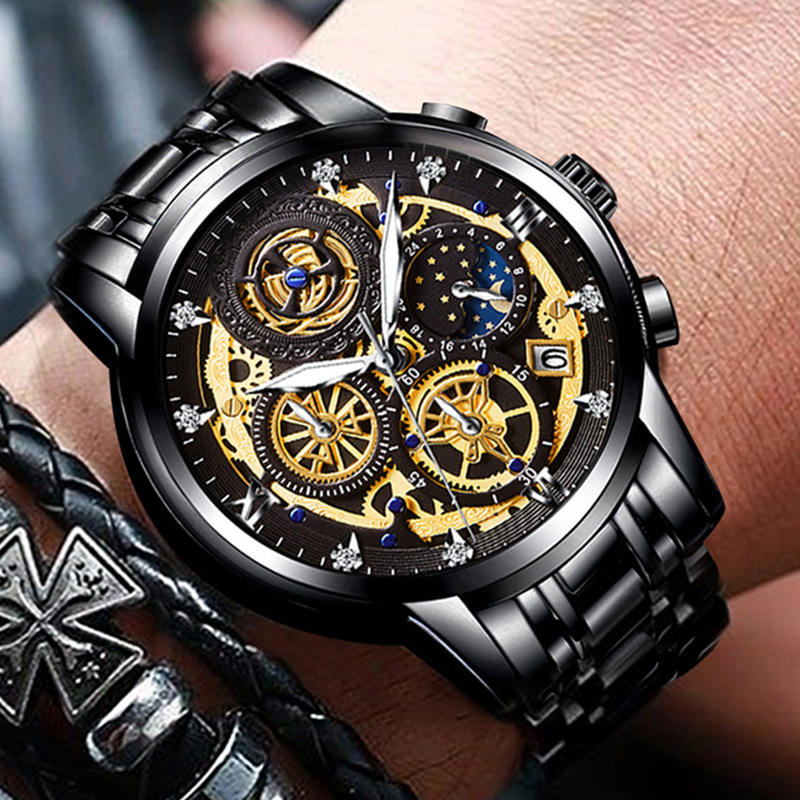 นาฬิกาข้อมือแบรนด์ดัง WISHDOIT ของแท้สำหรับผู้ชาย กันน้ำ สายสแตนเลส ควอตซ์ อนาล็อก แฟชั่น ธุรกิจ ลายดวงอาทิตย์ ดวงจันทร์ และดวงดาว