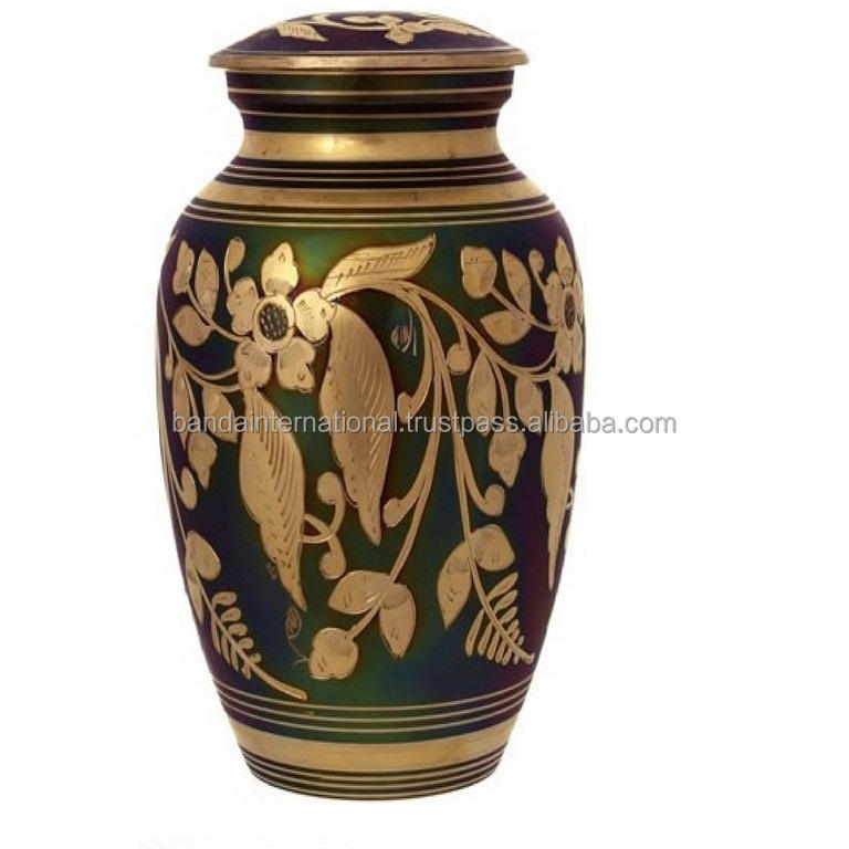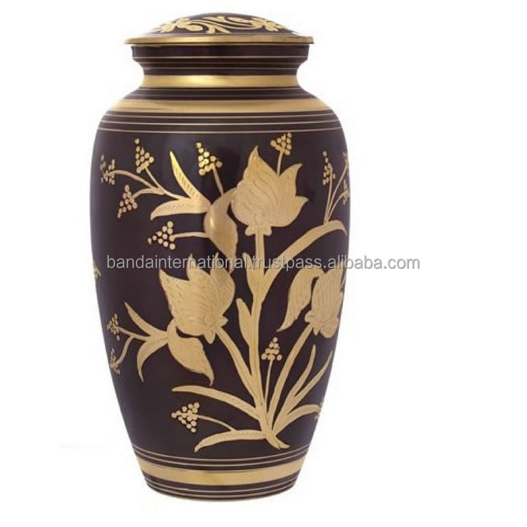 โกศใส่ศพทองเหลืองคุณภาพสูงคลาสสิกยอดนิยมพร้อมแกะสลักสีทองและสีดำที่สวยงามสำหรับขี้เถ้าของมนุษย์