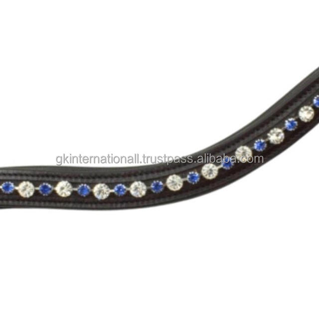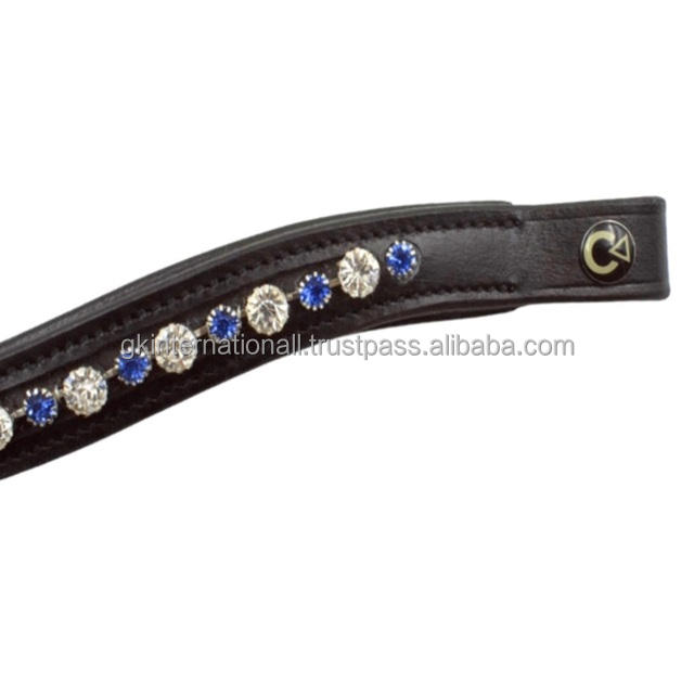 สายคาดหน้าผากม้าหนังแท้สีดำทรงโค้งประดับคริสตัลสีน้ำเงินและสีขาวพร้อมโซ่เพชร งานฝีมือชั้นเยี่ยม