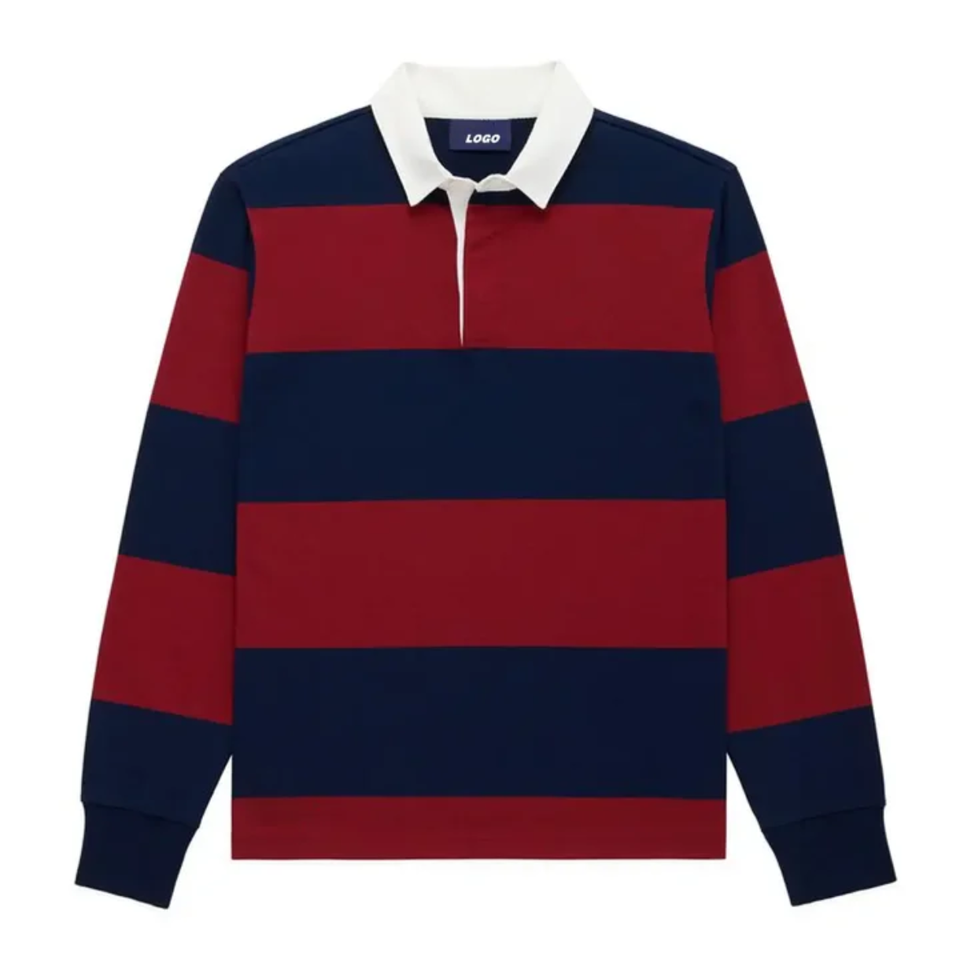 เสื้อโปโลรักบี้แขนยาวสำหรับผู้ชายเสื้อโปโลกีฬารักบี้แขนยาวลายทางเย็บสำหรับผู้ชาย