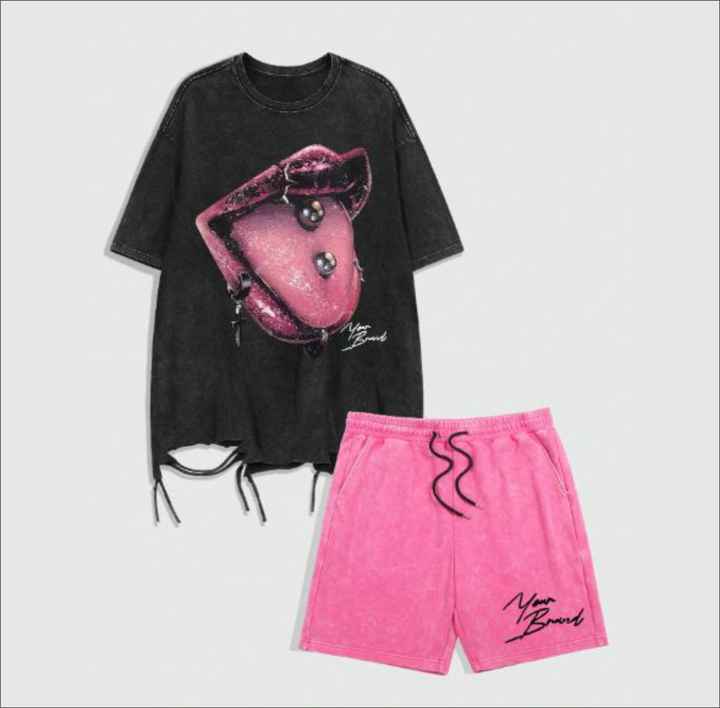 ชุดเซ็ตเสื้อผ้าผู้ชายสไตล์สตรีทแวร์ฤดูร้อนแบบกำหนดเองได้ 2 ชิ้น ผ้าฝ้าย 100% ทรงบ็อกซี่ เสื้อยืดครอป ระบายอากาศได้ดี กางเกงขาสั้นเข้าชุด