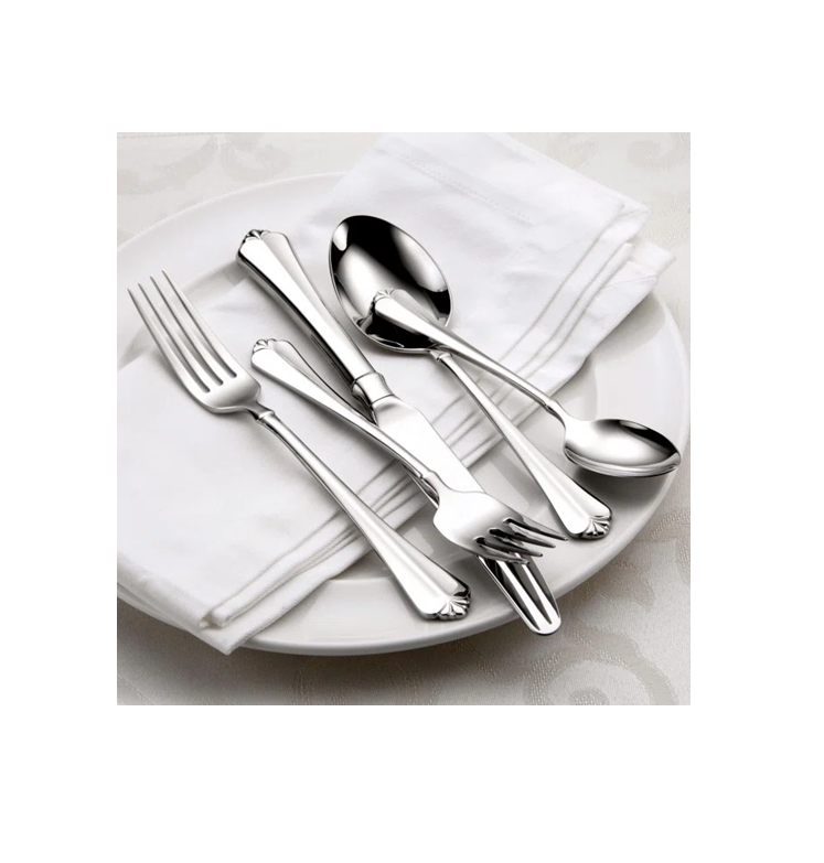 ชุดเครื่องใช้บนโต๊ะอาหารสแตนเลสเกรดอาหารชั้นนำชุดเครื่องใช้บนโต๊ะอาหารสำหรับงานแต่งงานแบบบาโรกส้อมเหล็กเคลือบพร้อมที่จับแกะสลัก