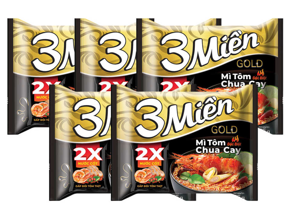 บะหมี่กึ่งสำเร็จรูปรสเผ็ดเปรี้ยวกุ้ง 3 มีน คุณภาพสูง ขนาด 65 กรัม ผลิตในเวียดนาม ไขมัน 2% ต้มสุกใน 2-3 นาที