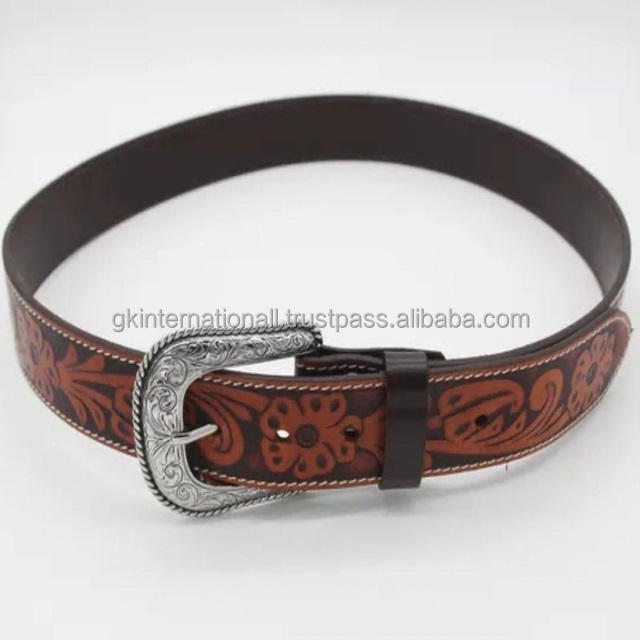 เข็มขัดหนังสไตล์ตะวันตกของผู้ชายลายนูนลายดอกไม้หนังวัวลายดอกพร้อมเข็มขัดคาดเอวหัวเข็มขัดคาวบอยวินเทจสำหรับกางเกงยีนส์