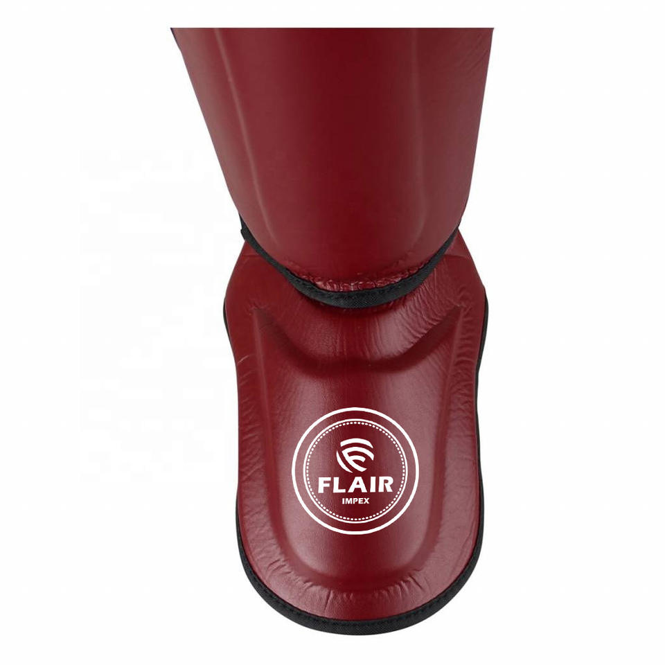 สนับหน้าแข้งสำหรับชกมวยทำจากหนังปรับได้อุปกรณ์ป้องกันขาและเท้าระบายอากาศได้ดีสำหรับต่อสู้