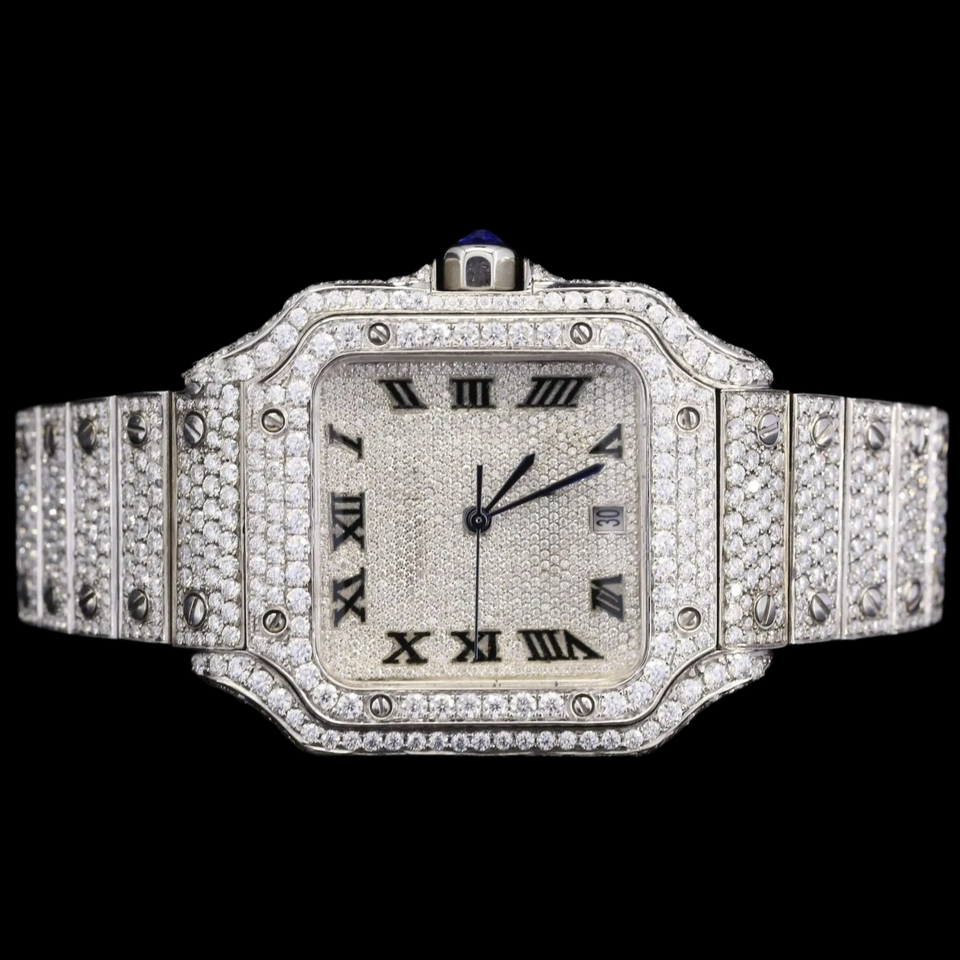 นาฬิกาข้อมือแฟชั่นทรงสี่เหลี่ยมคุณภาพสูง ประดับเพชรโมอิสซาไนต์เต็มหน้าปัด ตัวเลขโรมัน สายสแตนเลส กระจกควอตซ์