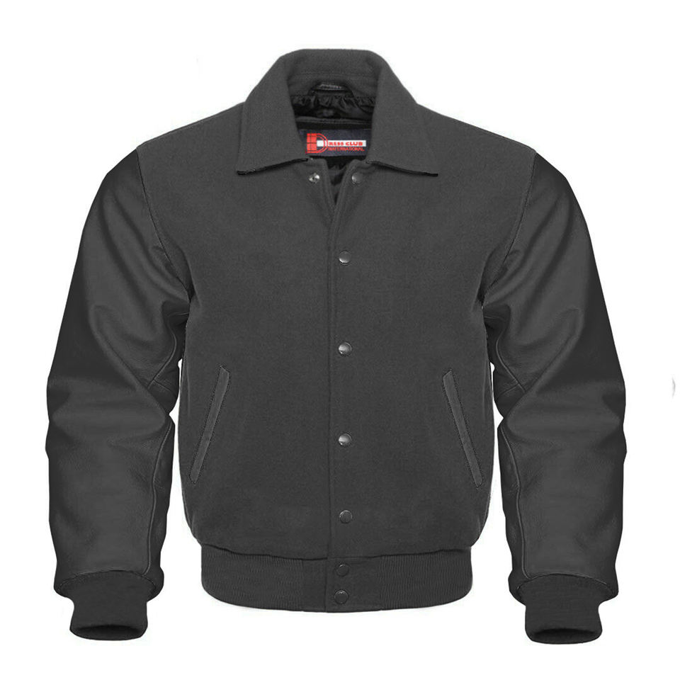 เสื้อแจ็กเก็ตเบสบอลฤดูหนาวเสื้อแจ็คเก็ตคอปกหนังแท้ขนแกะสีดำ