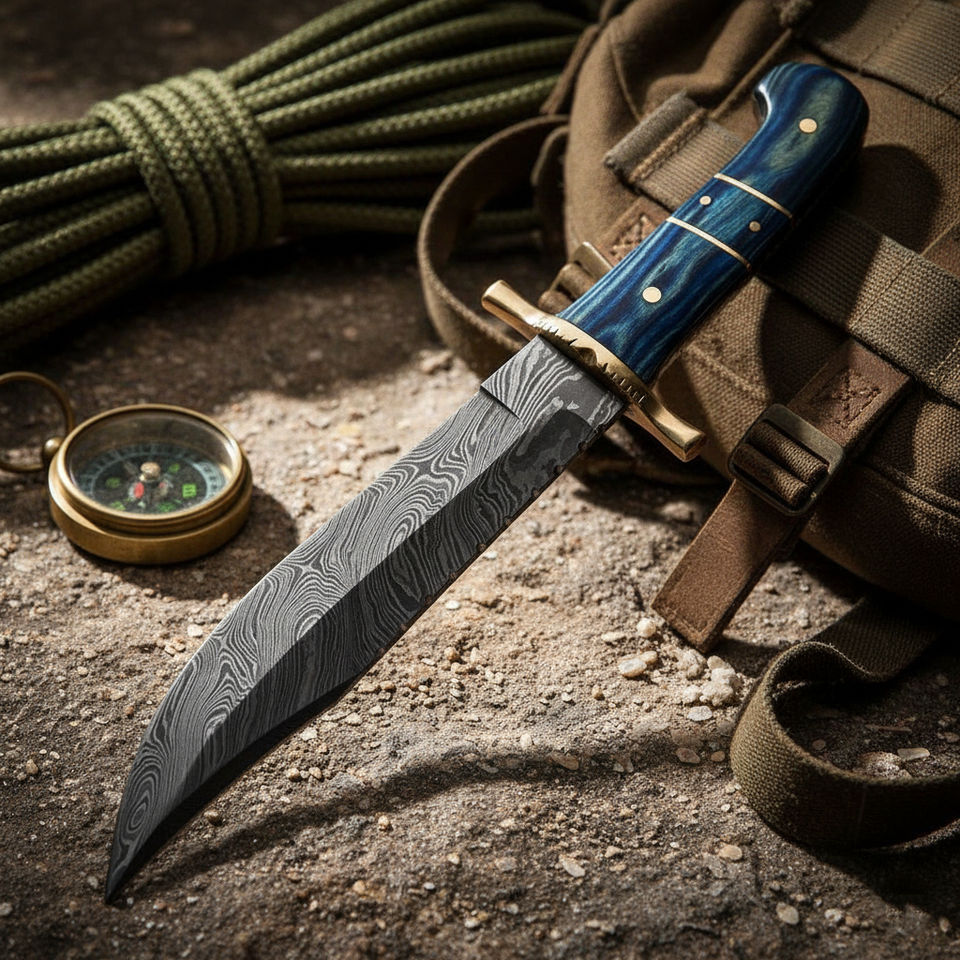 มีดโบวี่ล่าสัตว์ดามัสกัส ปี 2026 ทำจากเหล็กกล้าไร้สนิม ใบมีดหยัก พร้อมปลอกหนังทำมือ มีดล่าสัตว์สำหรับกิจกรรมกลางแจ้ง รับประกัน 3 ปี