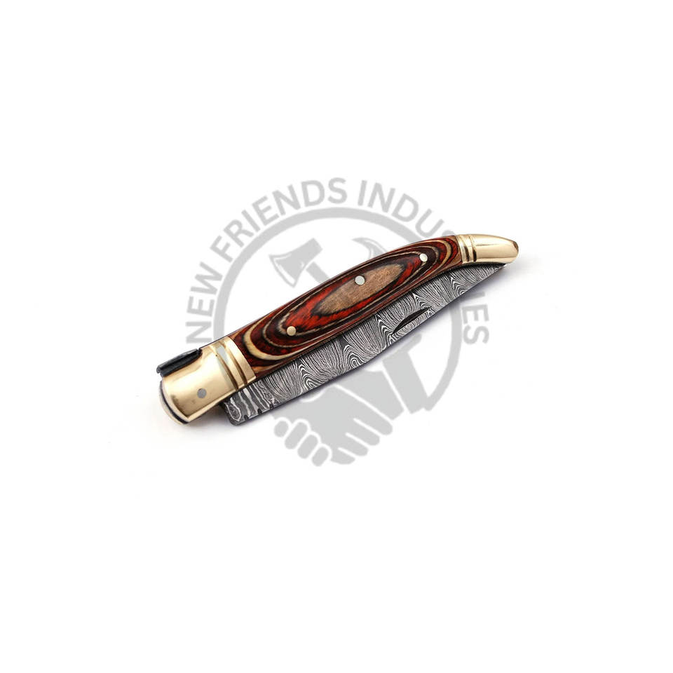 มีดพับเหล็กดามัสกัสรุ่นใหม่ยอดนิยม พร้อมปลอกหนัง ความยาว 8.5 นิ้ว มีดพก Laguiole พร้อมด้ามไม้สีน้ำตาลหลายเฉดและปลอกทองเหลือง