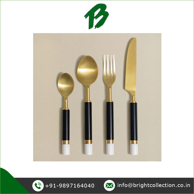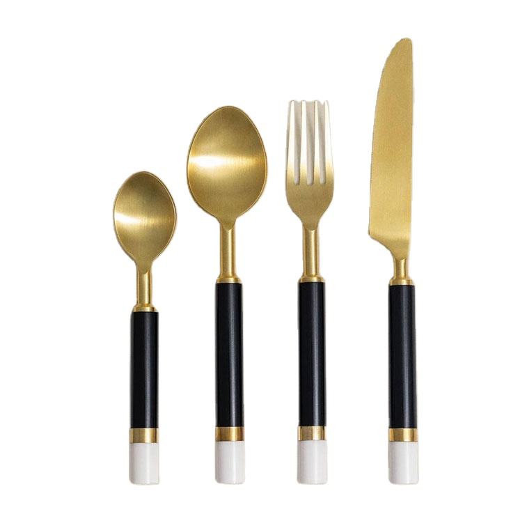 ชุดช้อนส้อมด้ามจับเรซินสีดำและสีขาวชุดชุบทอง