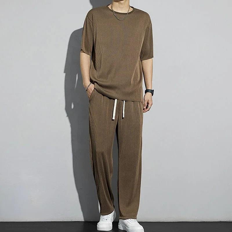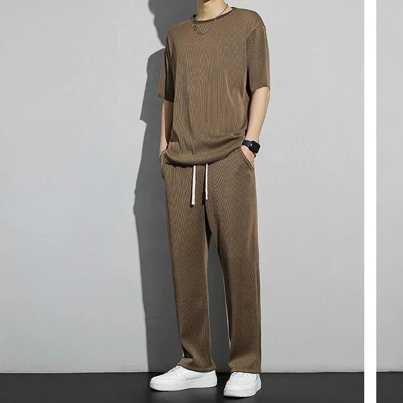 ชุดกางเกงขาสั้นแขนสั้นผ้าลูกฟูกทรงตรงลายเรียบสำหรับผู้ชาย ชุดกีฬาฤดูร้อน สไตล์สวยงาม เอวสูง ผ้าฝ้าย 100%