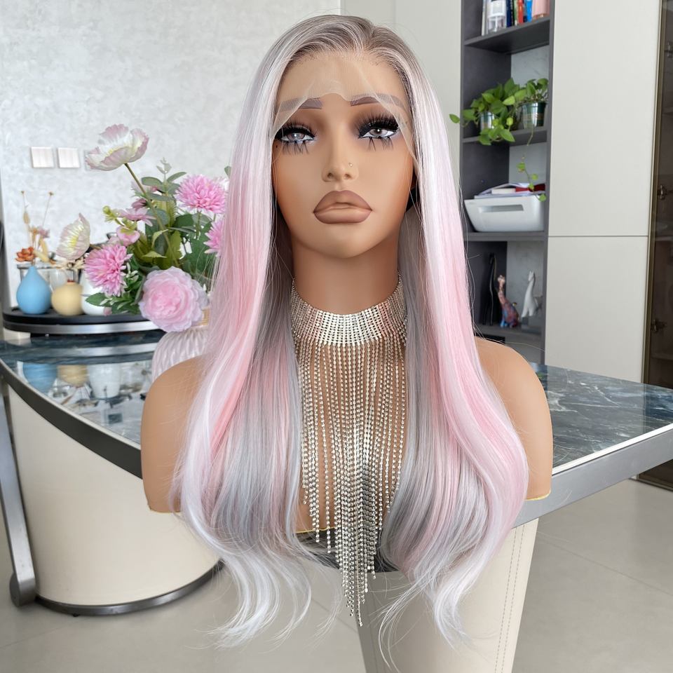 วิกผมสังเคราะห์คุณภาพสูงแบบลูกไม้ด้านหน้า 13x4 ลูกไม้โปร่งใส ความหนาแน่น 150% ทนความร้อนสูง สีเงินชมพู