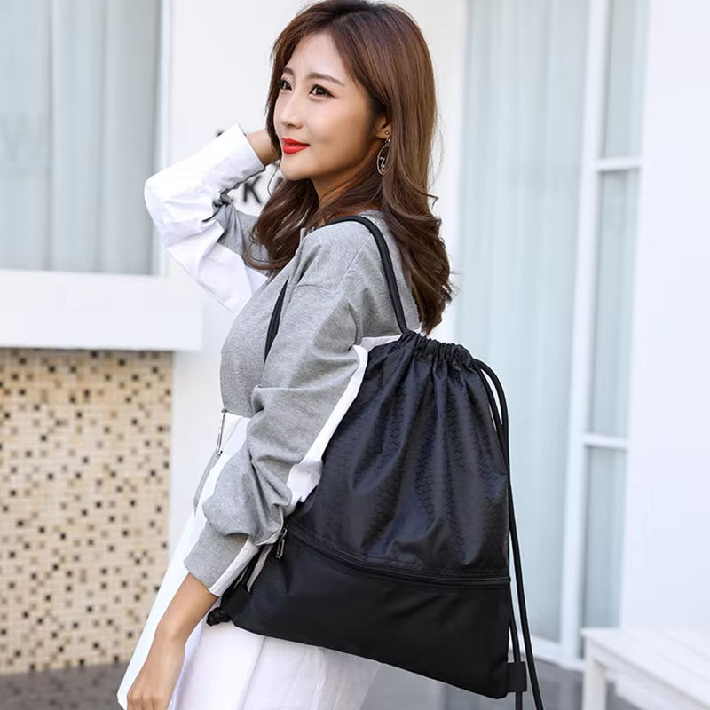 กระเป๋าเป้210D กันน้ำโพลีเอสเตอร์พับได้แบบพกพาสำหรับการเดินทางช้อปปิ้งที่มีเชือกรูดรองเท้าจัดเก็บเสื้อผ้ากำหนดเองได้